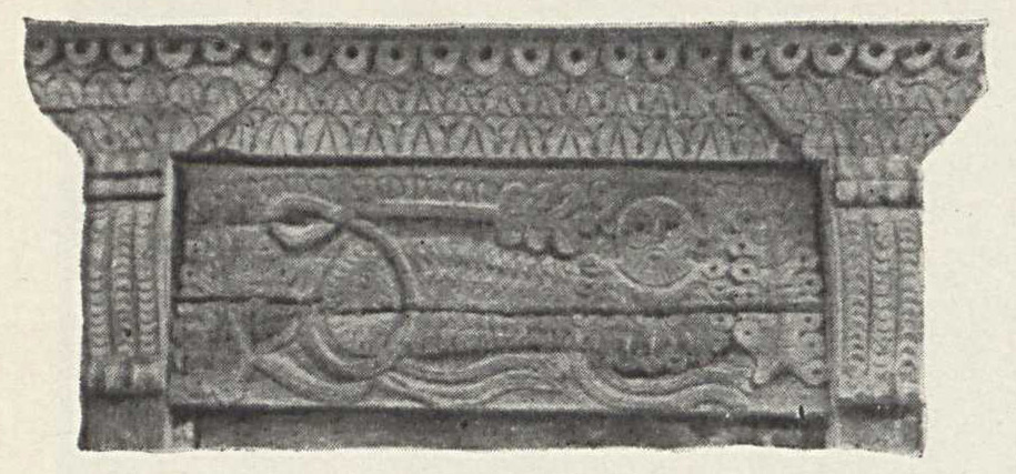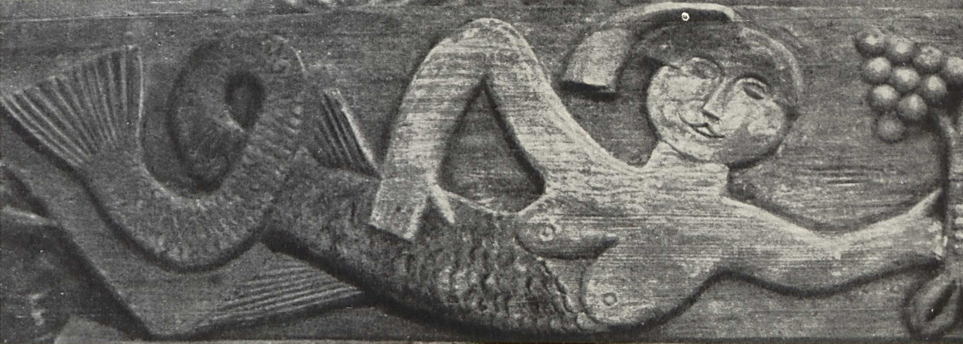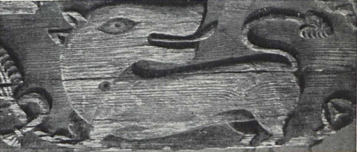 Фигура выполнена несколько робко и почти лишена декоративного начала. Для нас здесь интересна удачная попытка резчика возможно правдивее изобразить и позу, и характерные движения плывущего человека.