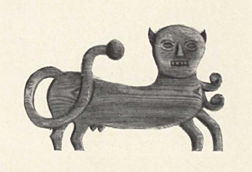 Изображений существ, похожих на этого льва, я еще не встречал, и, видимо, его надо считать редким и оригинальным персонажем, а своеобразный тип второго льва немного известен и по литературе, и по музейным собраниям. У него, конечно, не человеческая личина, как считают некоторые исследователи, — слишком четко изображен характерный для львов разрез губы, характерный для кошачьей породы рисунок ноздрей и ушей.