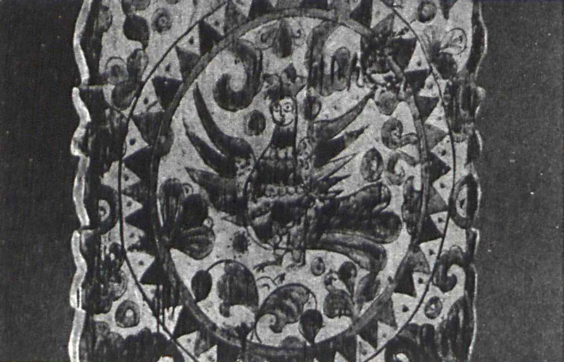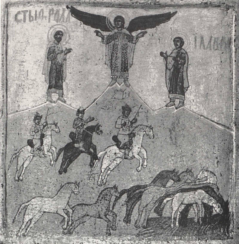 Фигуры святых и архангела Михаила значительно больше фигур пастухов, что еще раз подчеркивает их высокую роль на иерархической лестнице. Расположенные в верхней половине иконы, они будто опираются на стройный постамент нижней части: холмы, фигуры пастухов, табун лошадей у воды. Интересно, что фоном для святых служит архитектура, тогда как иконографией никакой архитектуры не предусмотрено. Стало быть, она несет чисто декоративную нагрузку. Кстати, таких отклонений от иконографии на Севере очень много. Быть может, именно от сурового однообразия жизни северные мастера стремились найти радость в красочной декоративной росписи, будь то икона или прялка. Однако никогда северный мастер не забывает своей «сверхзадачи» — создания образа, и потому виртуозное владение декором у народных мастеров Севера, как правило, только обогащает смысл иконы, в противоположность, к примеру, ярославским мастерам, у которых живопись погребена под обильным орнаментом. Одним из удивительно наивных и занимательных сюжетов Севера является «Явление богоматери пономарю Юрышу». Судя по надписям на иконах на эту тему, пономарь Юрыш был послан архиереем для освящения вновь открываемой церкви Богородицы на Тихвине. По дороге к церкви Юрышу явилась богоматерь в сопровождении Николы Чудотворца и изъявила свое недовольство тем, что крест на новой церкви ставится железный, «...и повеле пречистая Богородица на своей церкви иже на Тихвине поставить крест деревян, а не железен, понеже сын мой и бог распят был на кресте деревянном, а не на железном» (надпись с иконы «Явление богоматери пономарю Юрышу» из Онежской экспедиции ГЦХРМ имени академика И. Э. Грабаря). Юрыш передал ее повеление народу, но кузнец, сделавший крест, ослушался и полез на купол со своим крестом, откуда в наказание и свалился. Этим было завершено чудо, содеянное богоматерью. Вероятно, подоплекой этого сюжета явилась конкуренция между кузнецами и плотниками. Чудо же богоматери обеспечило торжество плотников, и с тех пор все деревянные церкви на Севере украшались деревянными крестами.