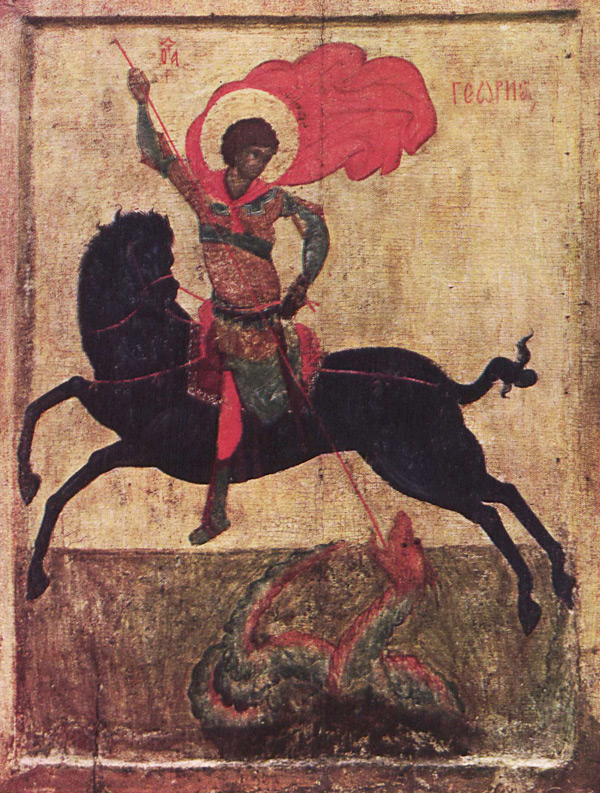 «Чудо Георгия и змие». XIV в. Псковская школа. Икона найдена на Севере. Собрание М. Розановой и А. Синявского.