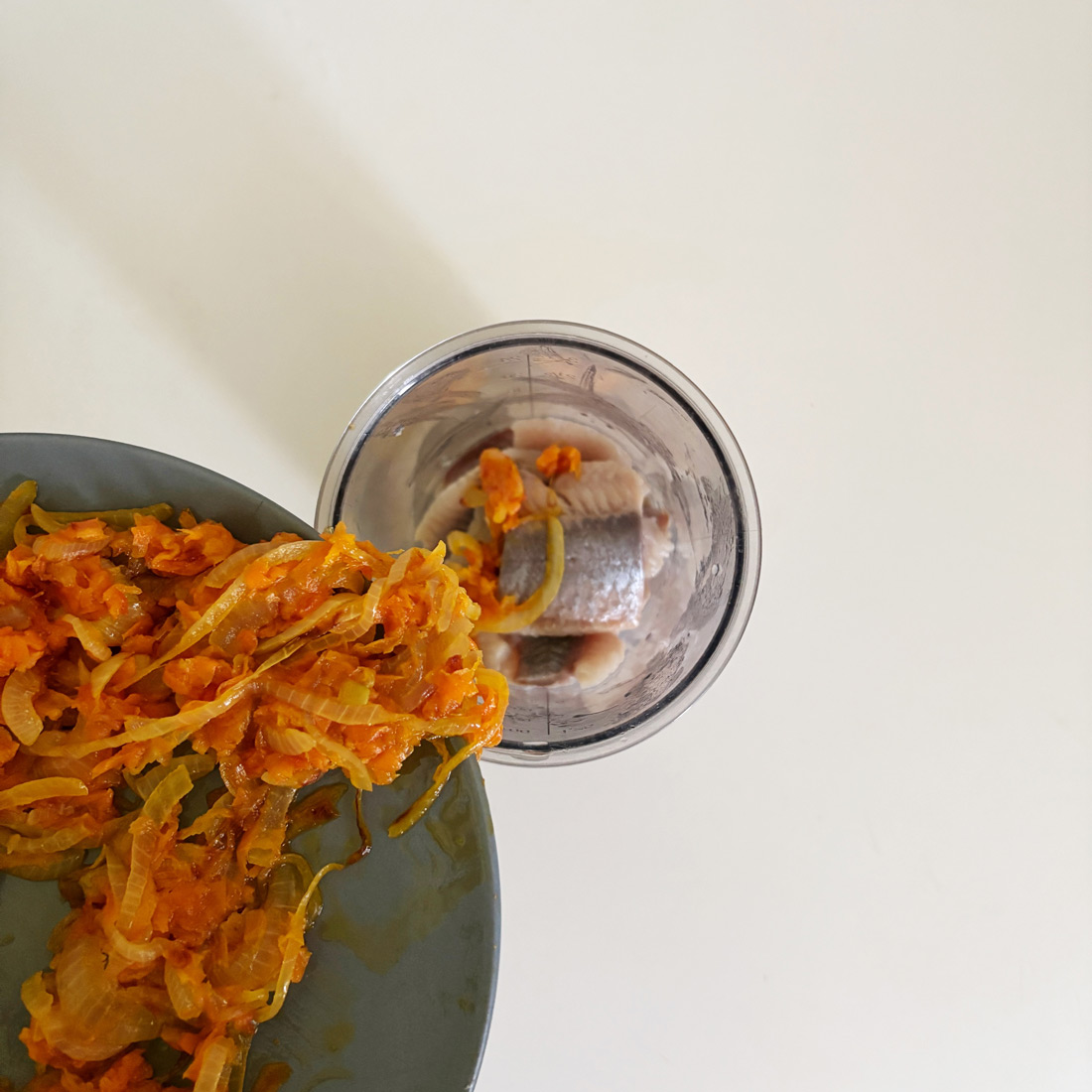 Морковь и лук пассеруют на сливочном масле до готовности, охлаждают и вместе с сельдью пропускают через мясорубку с мелкой решёткой.