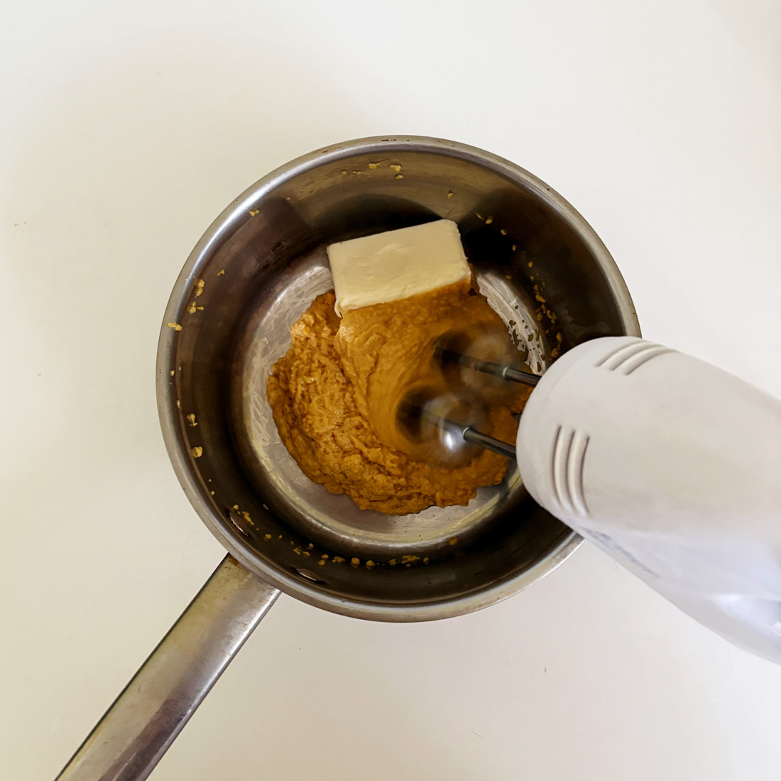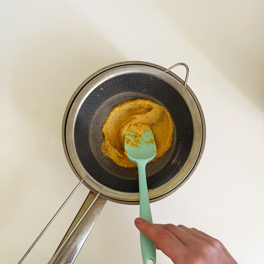 Полученную массу протирают через протирочную машину, добавляют остальное сливочное масло и хорошо взбивают.