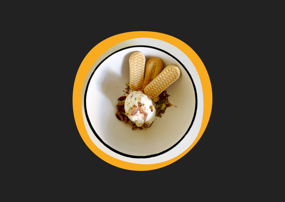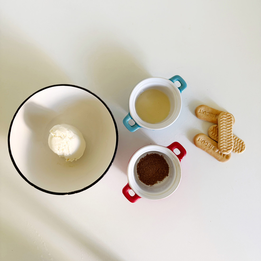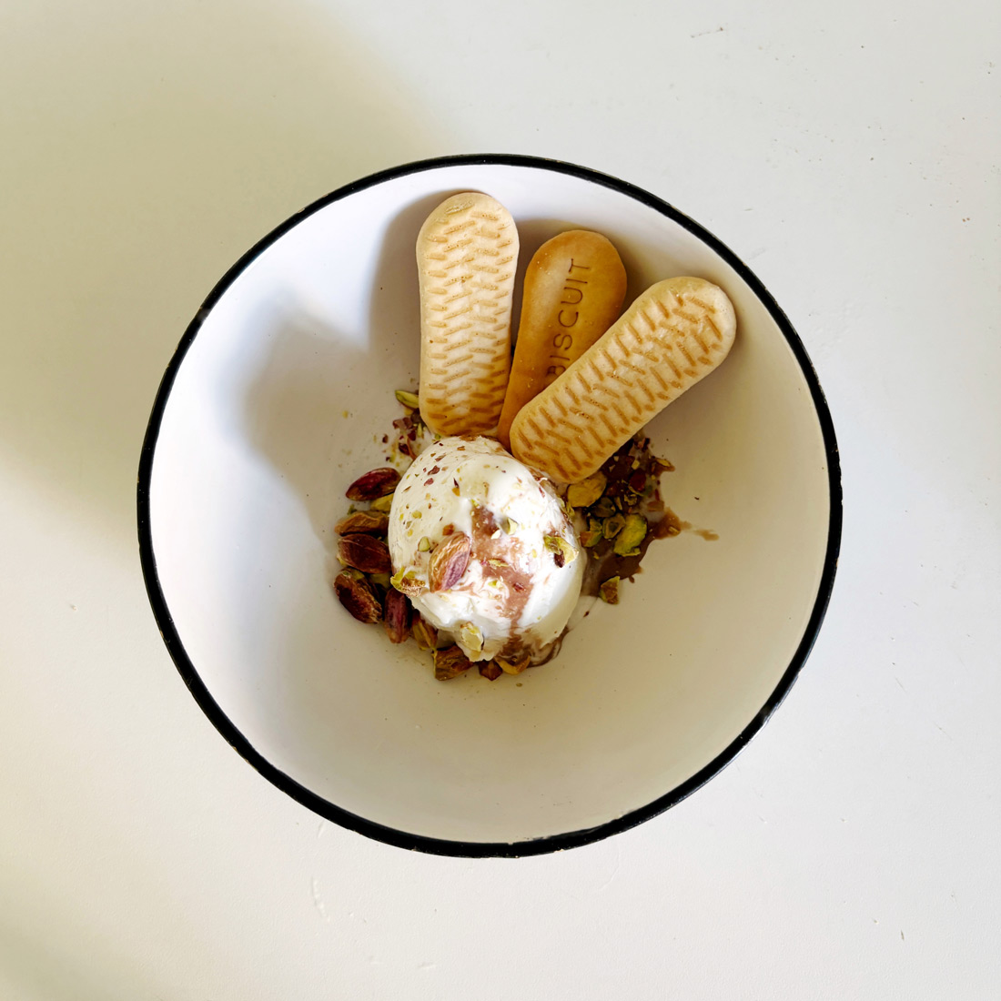 пломбир сливочный — 150 г, соус шоколадный — 20 г, бисквит или печенье — 20 г, жареный миндаль или другие орехи — 10 г.