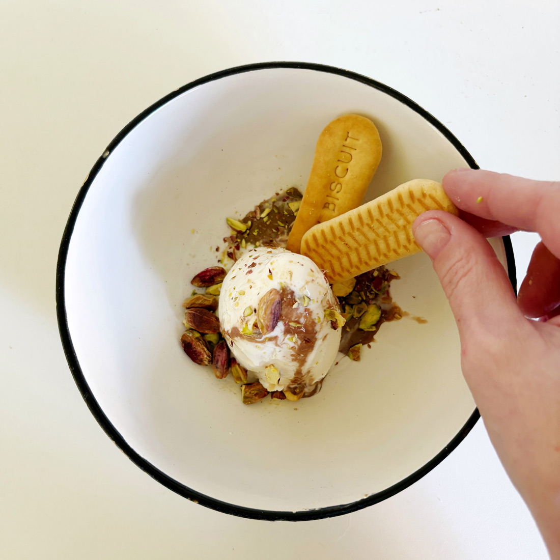 Положите сливочный пломбир в блюдце или вазочку, полейте сверху шоколадным соусом (сгущённое молоко перемешайте с какао), посыпьте миндалём, сверху положите кусочек бисквита или печенье.
