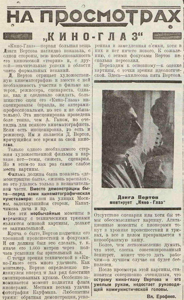 В день премьеры Вертов выступает в кинотеатре с манифестом: «Вы разочаруетесь, если пришли сюда, чтобы увидеть увлекательную любовную историю. Вы разочаруетесь, если ждете захватывающего детектива, разочаруетесь и тогда, если вы думаете здесь увидеть какие-нибудь необыкновенные трюки и фокусы. Но если вы учтете, что то, что мы вам сейчас покажем, это только разведка ощупью одного киноаппарата, если вы примете во внимание, что это только первая серия, одна шестая часть первого путешествия Кино-глаза, то и эти простые кусочки жизни, снятые, а не разыгранные, — дадут вам некоторое удовлетворение».