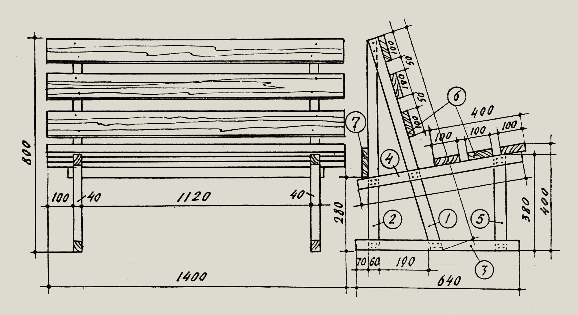 Затем боковины соединяются между собой досками сиденья и спинки (деталь 6). С задней стороны к вертикальным брускам прибивается широкая доска — 150–200 мм (деталь 7) для увеличения жёсткости скамейки.