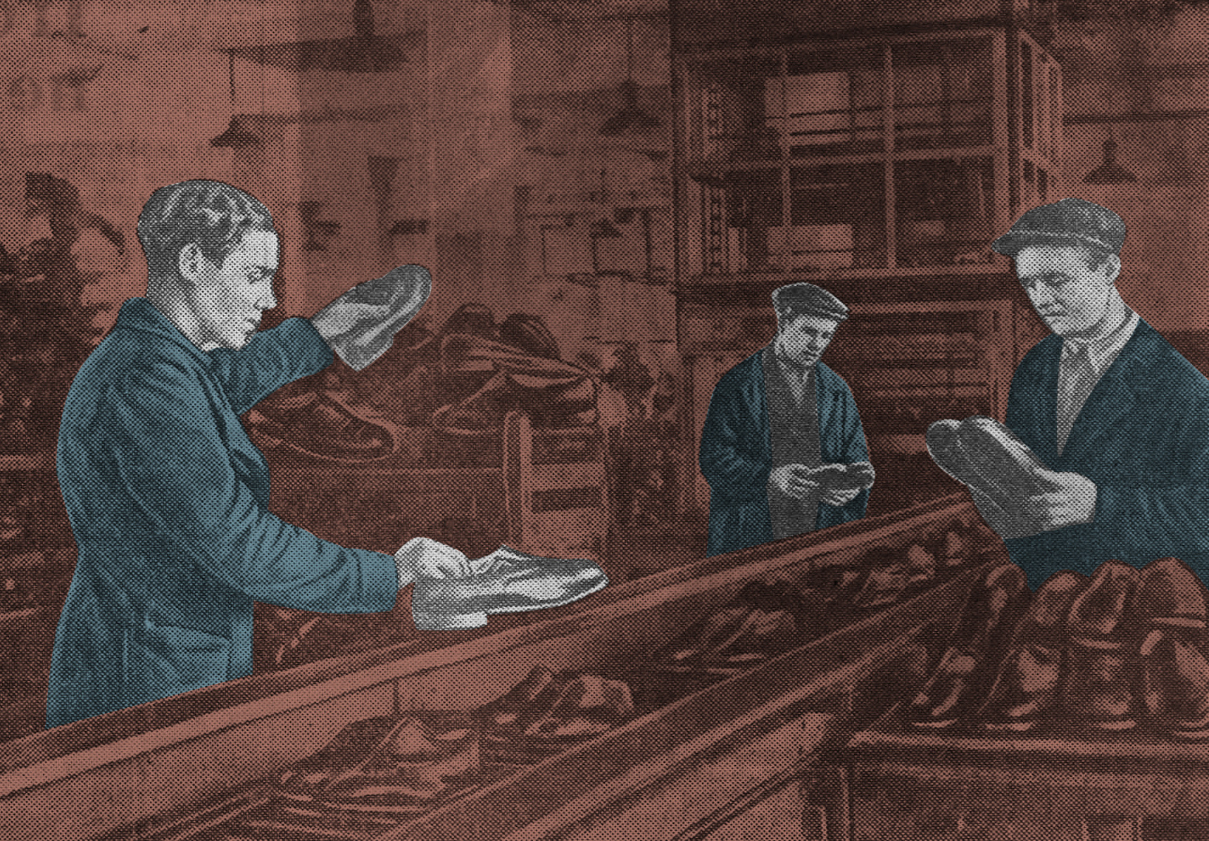 Цех мужской рантовой обуви фабрики «Парижская коммуна» ежемесячно увеличивает выпуск своих изделий. Слаженно работают стахановцы А. Степанов и Н. Логунов, принимающие с конвейера готовые ботинки.