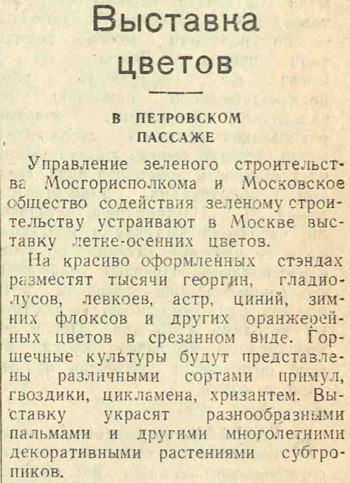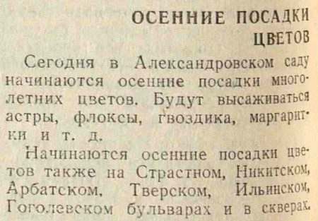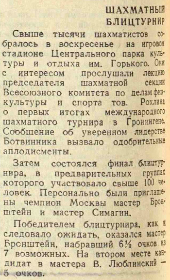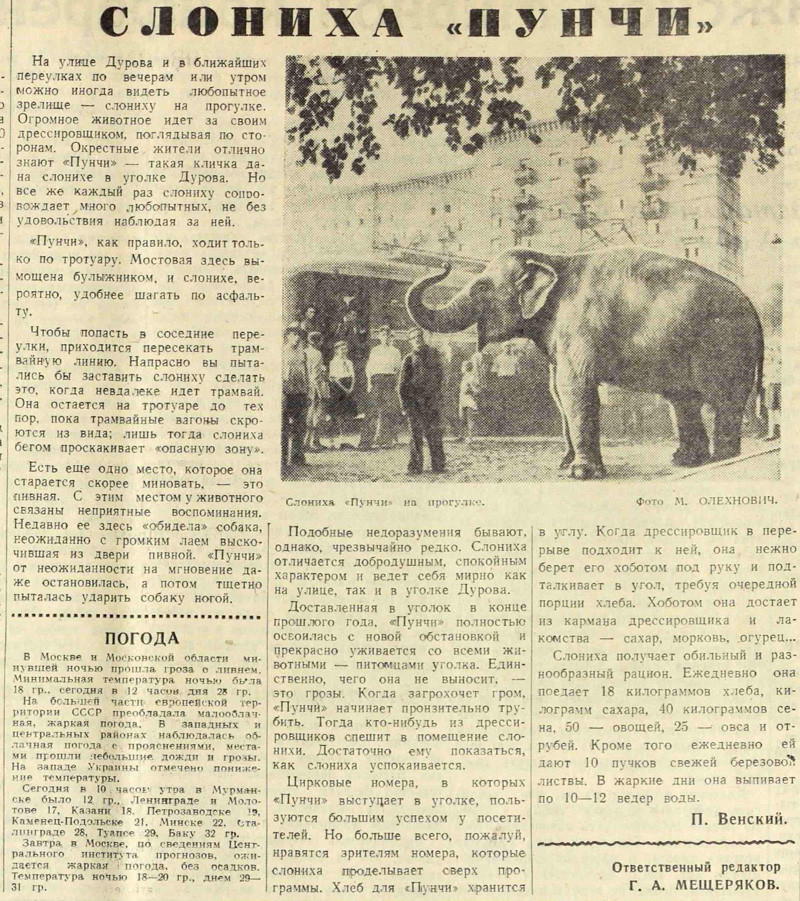 Раз в неделю «Электронекрасовка» рассказывает о событиях, произошедших в Москве и жизни москвичей в разные годы, основываясь на газетных и журнальных заметках и дневниковых записях. Представляем хронику быта с 20 по 26 августа 1946 года. На этой неделе: в Парке Горького прошел блицтурнир по шахматам среди 100 человек; в Тушино состоялся авиапарад; открылись школьные базары; на улице Дурова по вечерам выгуливают слона; в Петровском пассаже проходит выставка цветов, а на стадионе «Динамо» экспозиция финской промышленности.