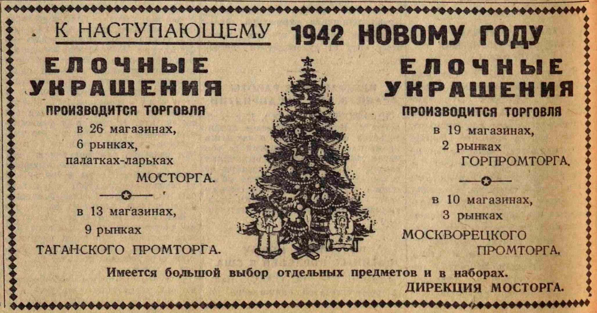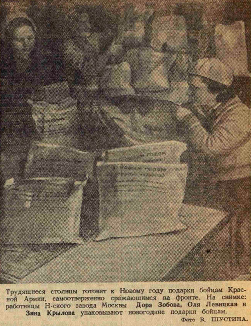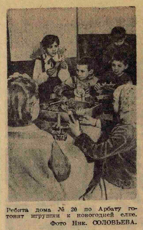 Большой праздник новогодней елки готовит для детворы своего района Киевский райсовет. В пяти бомбоубежищах устанавливаются красивые елки: в домах на Арбате, Извозной улице, улице Маркса и Энгельса, улице Чайковского и в Филях. В бомбоубежищах будут выступать коллективы художественной самодеятельности пионеров и школьников, а также артисты эстрады и театров. К новогодним елкам пионеры готовят много игрушек.