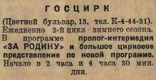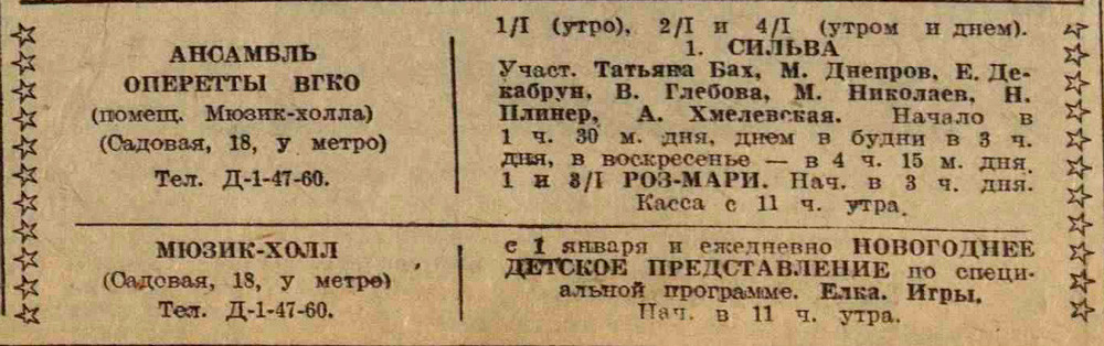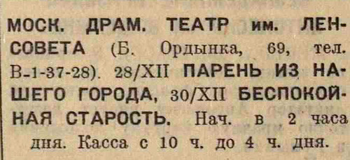 Филиал Большого театра увеличивает количество спектаклей. Начиная с новой недели, вместо четырех спектаклей будет даваться пять. В среду 31 декабря пойдет опера Верди «Травиата», 1 января 1942 года – балет «Конек-горбунок», 3 января – опера Чайковского «Евгений Онегин». В воскресенье состоятся два спектакля: утром, в 11 часов, – балет «Тщетная предосторожность», в 3 часа дня – опера Рубинштейна «Демон».