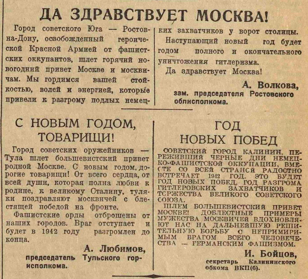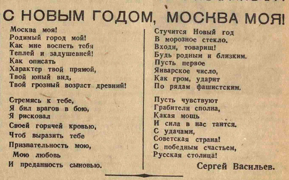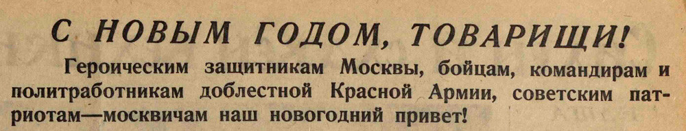 В преддверии Нового года Некрасовка запускает спецпроект «Новогодняя Москва в военное время. 1941–1945». Подборка заметок и фотографий из газеты «Вечерняя Москва», которая продолжала выходить ежедневно и не только публиковала военную сводку, но и уделяла много внимания мирным городским событиям. Несмотря на военные действия на подступах к Москве, москвичи и город продолжают жить повседневной жизнью: ходить в кино и на каток, участвовать в соревнованиях, покупать новогодние елки и готовиться к празднику. Именно эти маленькие радости и позволяют сохранить боевой дух и настрой в эти военные годы.