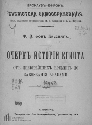 История Египта немецкого египтолога Фридриха Вильгельма фон Биссинга. В книге сделана попытка изобразить формы общественной жизни отдельных периодов в конкретных примерах и биографиях.