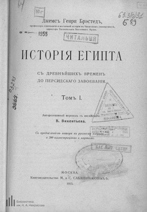 Главный труд американского археолога и историка Джеймса Генри Брэстеда «История Египта от древнейших времён до персидского завоевания» до сих пор остаётся одной из фундаментальных книг в египтологии. В книге уделено внимание разработке хронологии истории Древнего Египта. Текст сопровождается большим количеством иллюстраций и карт.