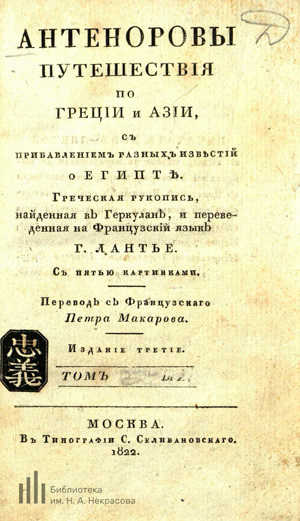 Книжный памятник Некрасовки. Приключенческий роман Этьена Франсуа де Лантье, написанные им якобы по греческой рукописи, найденной в развалинах Геркуланума, погибшего одновременно с Помпеями после извержения Везувия. В пятом томе описаны приключения и путешествия афинского полководца Аристида.