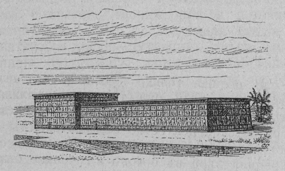 «Египетский храм был не столько собранием верующих для молитвы, сколько жилищем бога и крепостью. Древний египтянин не знал большего несчастья, как оскорбление своей святыни врагом; поэтому храм был окружён высокой стеной, саженей в 5 толщины, которая лишала его внешней формы, делала здание похожим снаружи на колоссальную коробку. Внутри, за этими стенами, находилось иногда несколько храмовых построек, занимавших огромное пространство.
