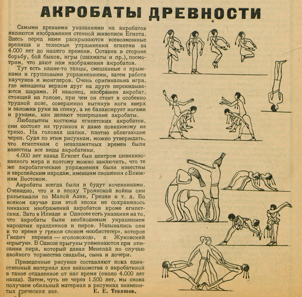 Журналист Е. Тевяшов в заметке «Акробаты древности» в журнале «Цирк и эстрада» № 5 за 1929 год опознаёт и описывает древнеегипетских акробатов по рисункам в пирамидах. «Любопытны костюмы египетских акробатов, они состоят из трусиков и даже по-видимому из трико. На головах шапки, плотно облегающие череп. Судя по этим рисункам, можно утверждать, что египтянам с незапамятных времён были известны все виды акробатики».