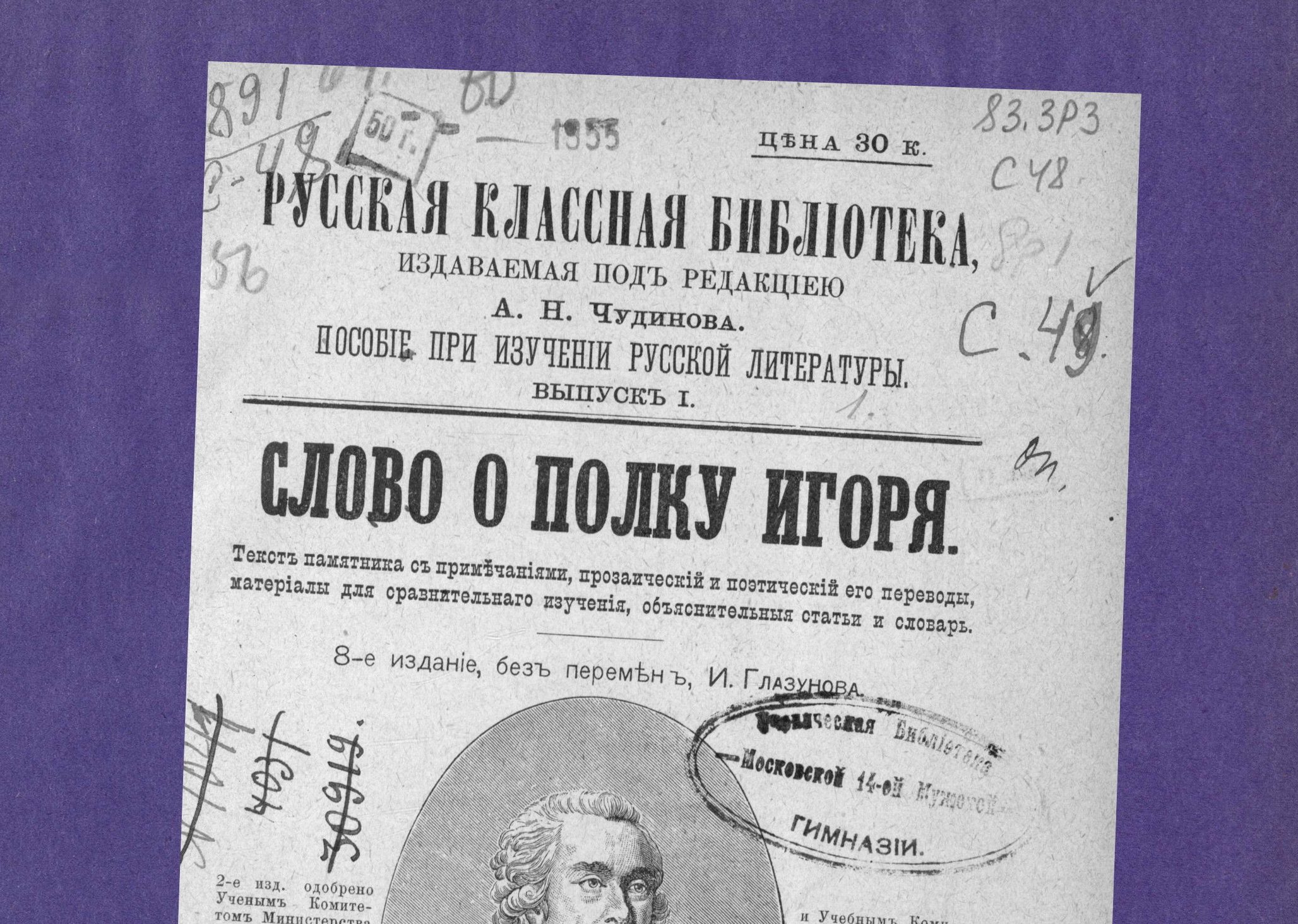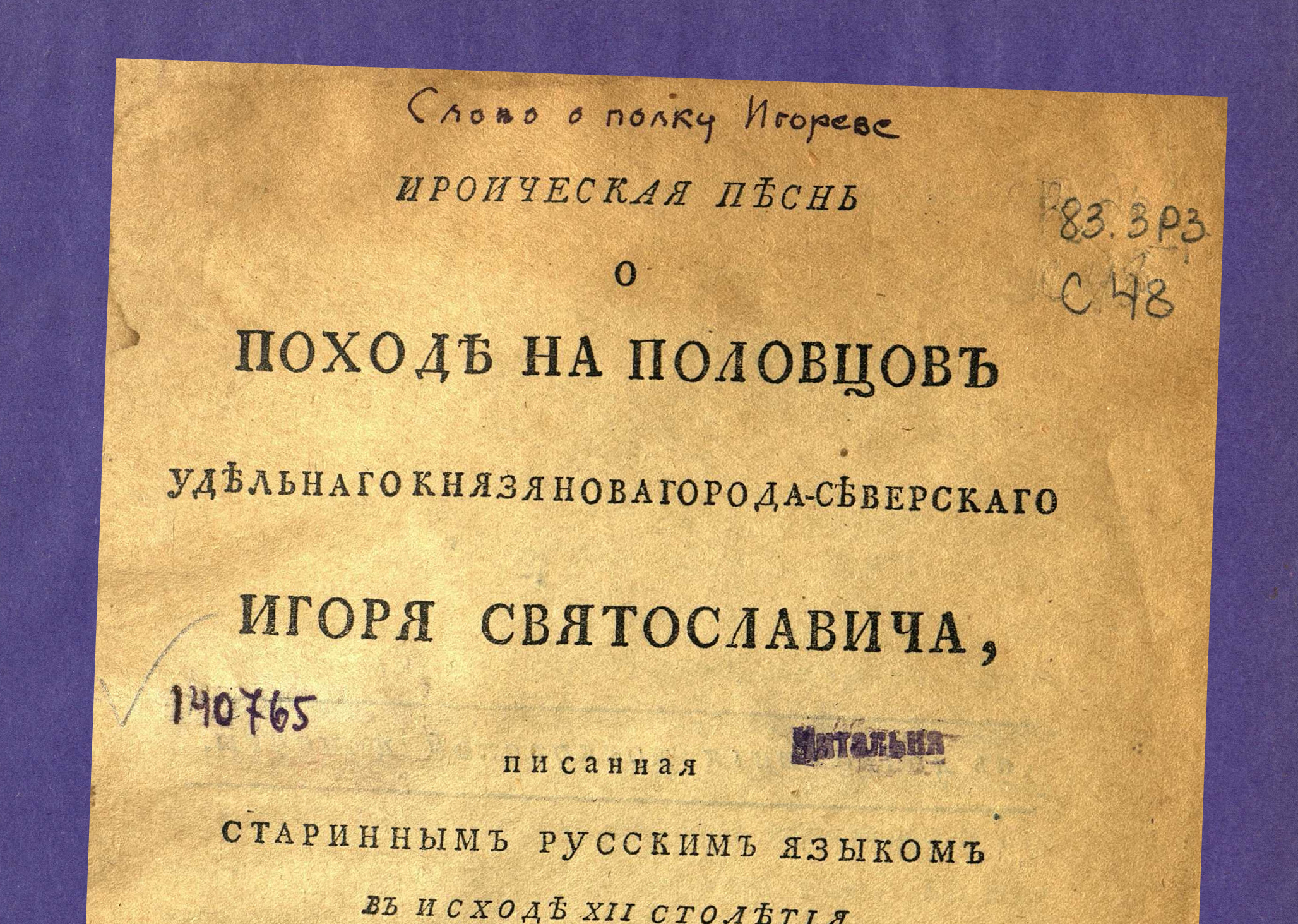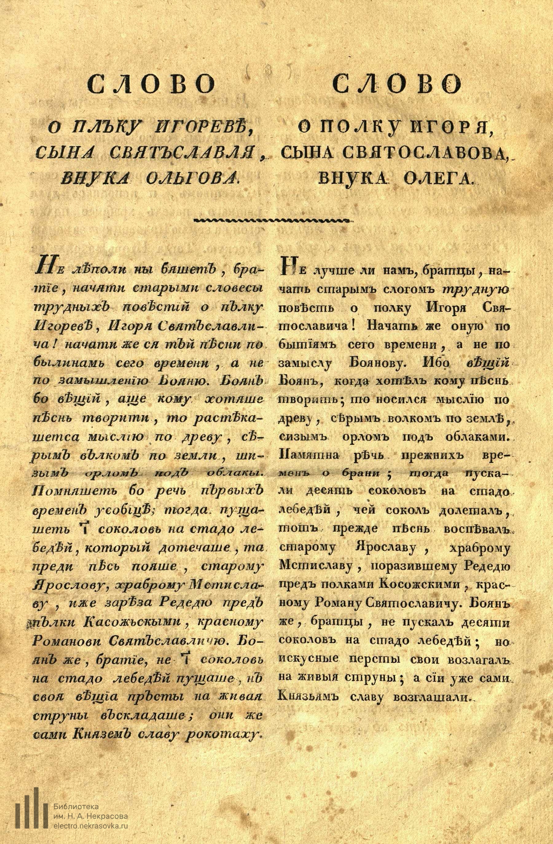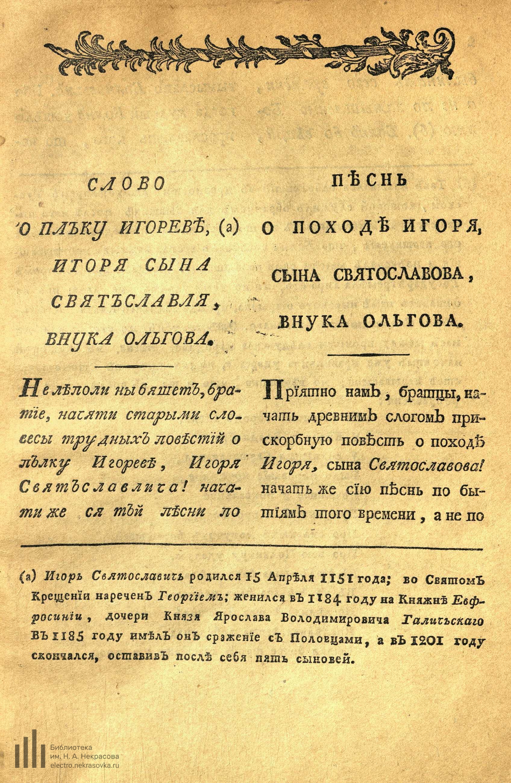 1800Первое и прозаическое издание «Слова», точное название которого «Ироическая песнь о походе на половцев удельного князя Новагорода-Северского Игоря Святославича», было издано в 1800 году владельцем оригинальной рукописи, коллекционером и собирателем древностей графом Алексеем Мусиным-Пушкиным. Граф утверждал, что купил рукопись в конце 1780-х годов у бывшего настоятеля Спасо-Преображенского монастыря в Ярославле. Произведение представлено в виде двух столбцов — на древнерусском языке и современном на тот момент переложении. Сама рукопись сгорела во время пожара 1812 года в доме Мусина-Пушкина, расположенном в Москве на Разгуляе. Кстати, дворец находится совсем рядом с Некрасовкой.
