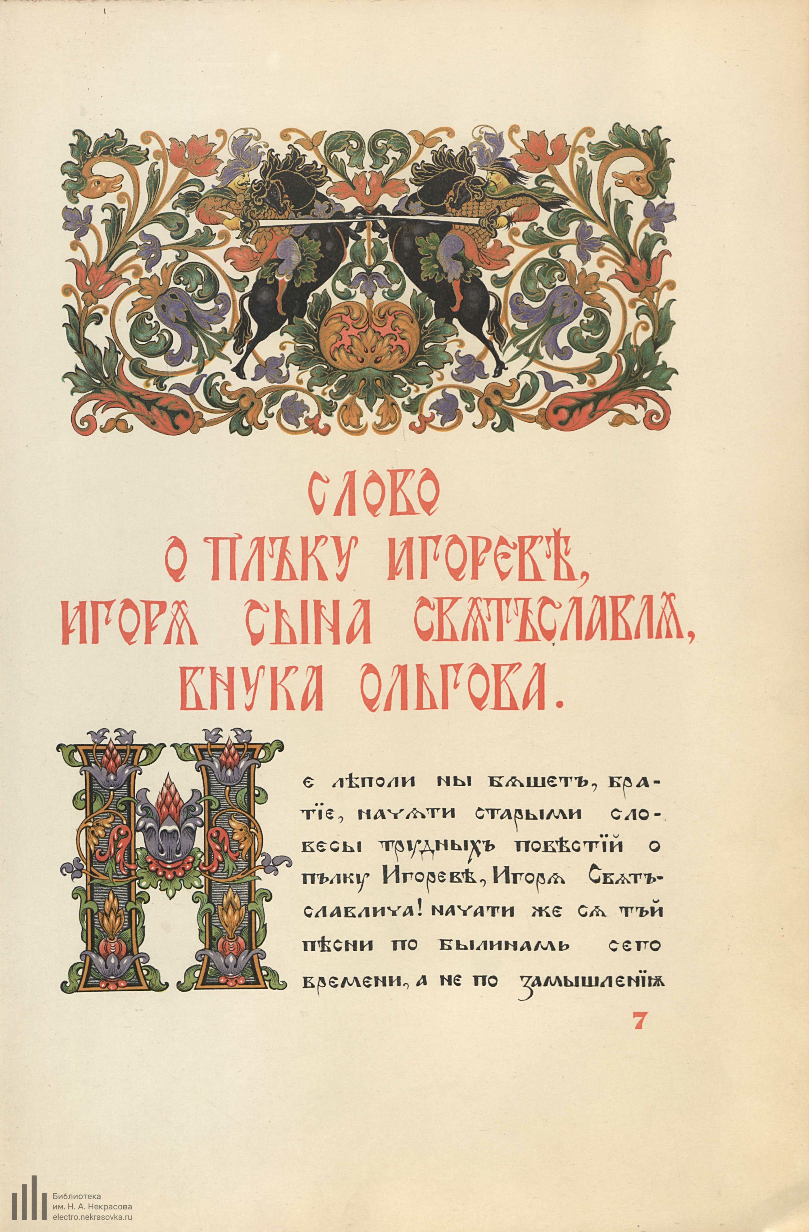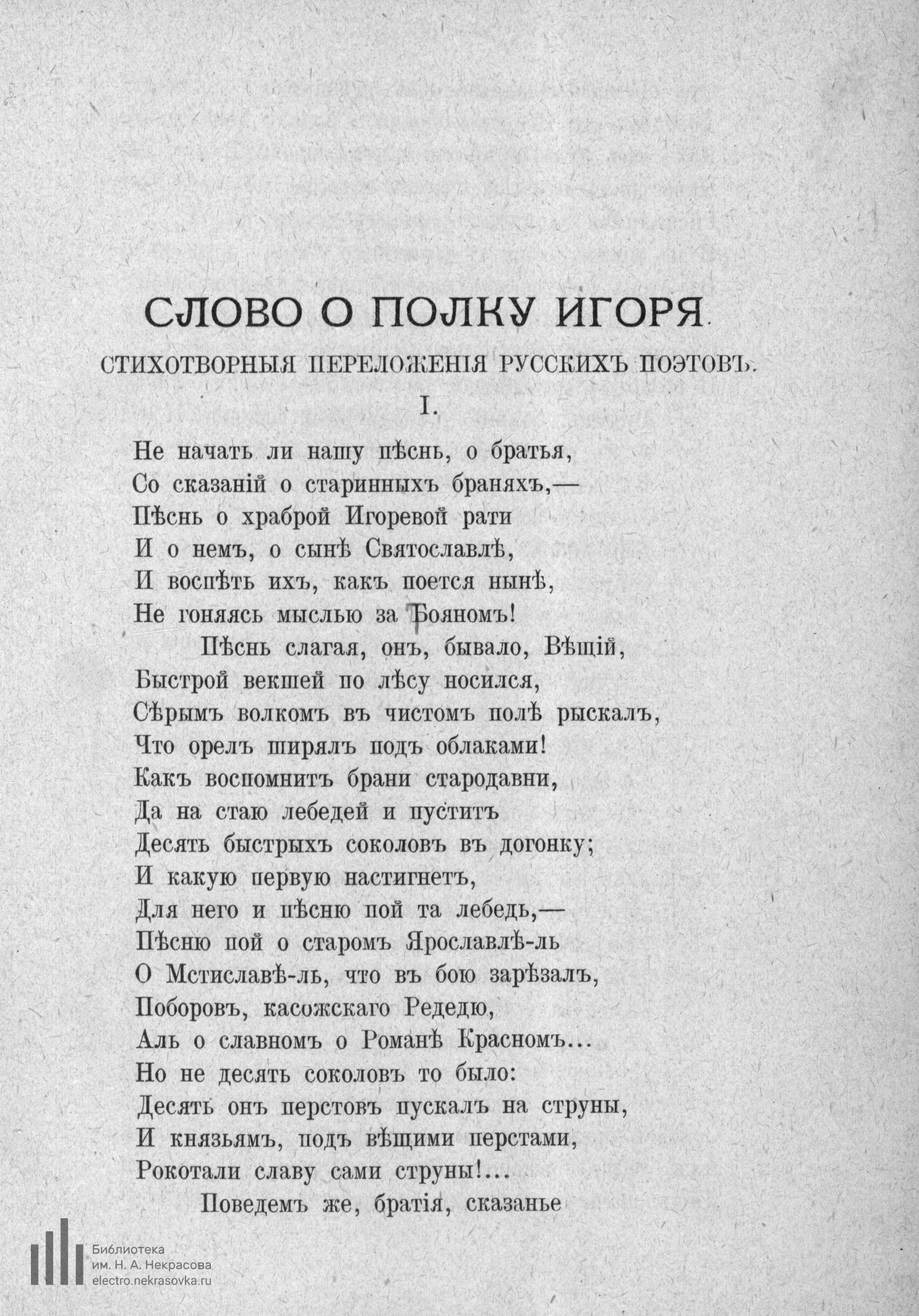 На современный русский язык «Слово» переводилось не менее 80 раз, переводы принято делить на прозаические, ритмизованные и поэтические. «Электронекрасовка» провела ревизию своих оцифрованных фондов и собрала издания «Слова о полку Игореве» разных лет.