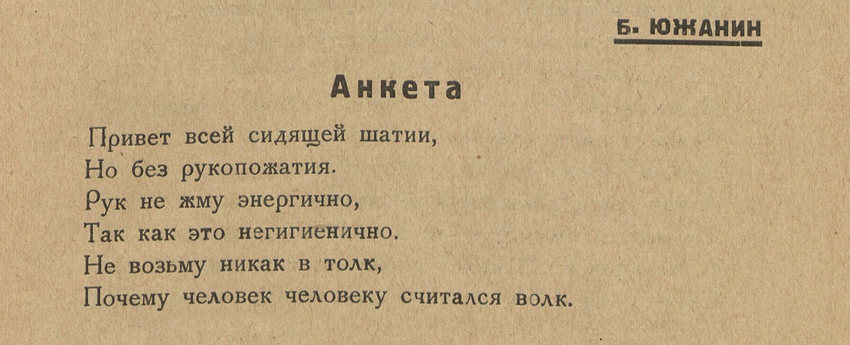 Фрагмент агитпостановки «Анкета», написанной в 1926 году Борисом Южаниным для эстрадного коллектива «Синяя блуза», где обозначен один из тезисов санитарного просвещения — «долой рукопожатия».