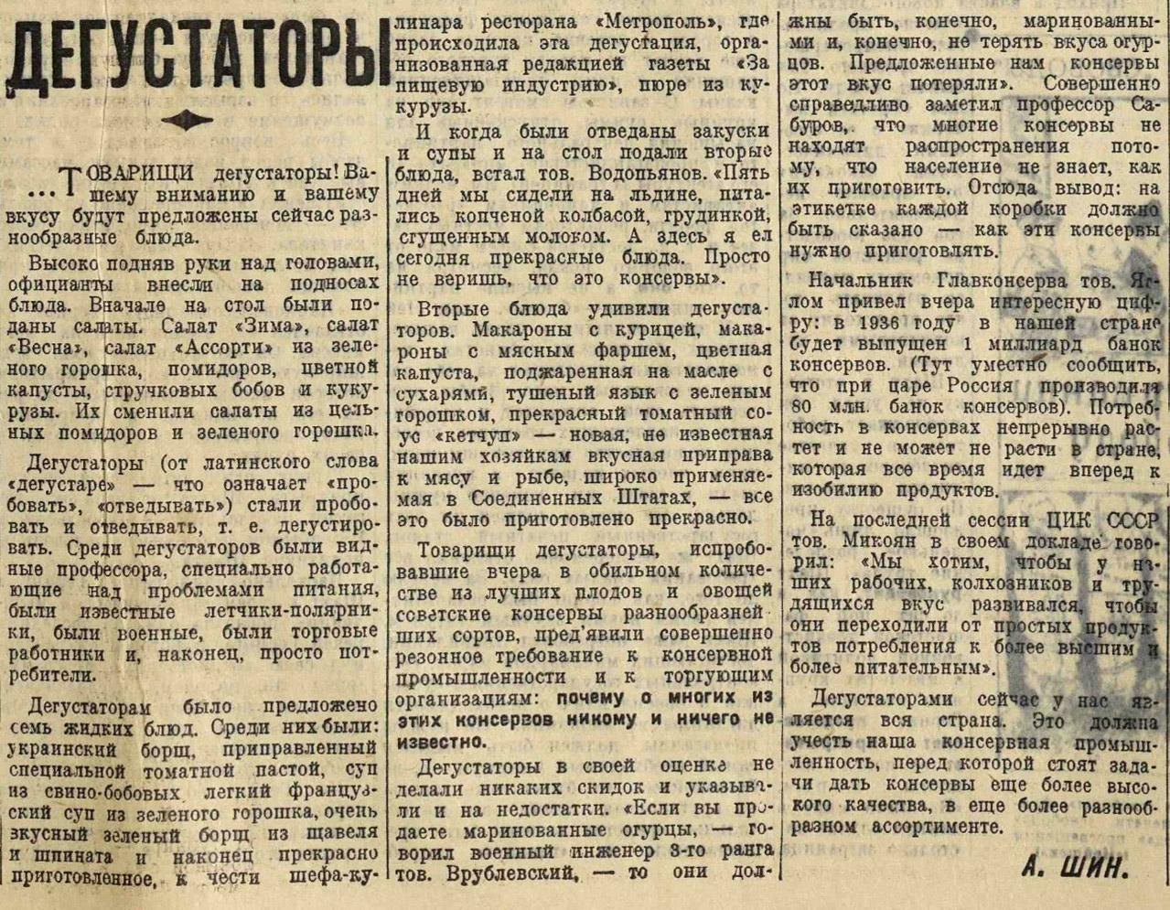 Товарищи дегустаторы, испробовавшие вчера в обильном количестве из лучших плодов и овощей советские консервы разнообразнейших сортов, предъявили совершенно резонное требование к консервной промышленности и к торгующим организациям: почему о многих из этих консервов никому и ничего не известно».