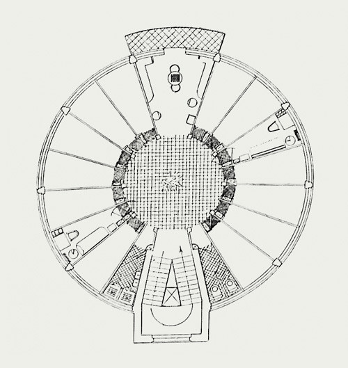 Все эти системы очень подвижны и могут быть перекомпонованы в зависимости от размеров территории, требуемого количества квартир и т. д. Приведу еще одно решение жилкоммуны, предложенное Ленинградским строительным институтом. Проект состоит из замкнутого симметричного трехосного корпуса из шести этажей, рассчитанного на 660 жильцов.