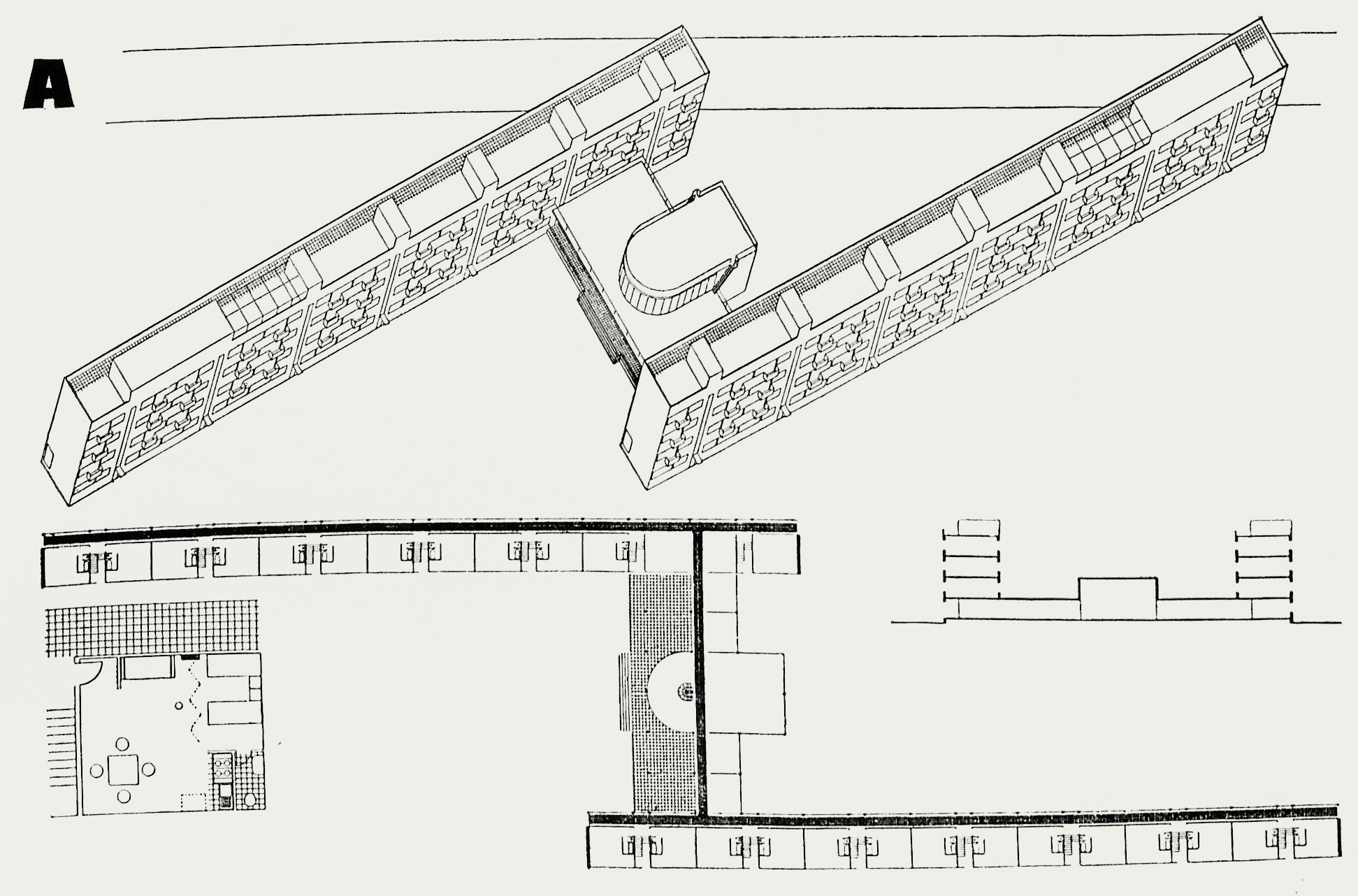 До сих пор строительная деятельность жилищно-коммунальных хозяйств и крупных центральных кооперативов проявляла себя в односторонней борьбе с нехваткой жилья в нашей стране. Радикальных экспериментов в создании нового жилья фактически не было. Архитектурный факультет ВХУТЕМАСа получил от строительного отдела Моссовета задание спроектировать поселение. Мы приводим здесь пример одного решения: круглая башня задумана как дом для несемейных и состоит из отдельных комнат ячеек площадью 6 × 9 метров. Для общественной деятельности предназначена примыкающая к башне хозяйственно-бытовая постройка.