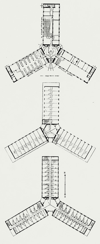 Один коридор обслуживает три этажа. Жилые ячейки состоят из двух или трех комнат. Три основных типа общественных помещений (столовая, детский центр, центр отдыха) расположены в крыльях первого этажа каждого здания.