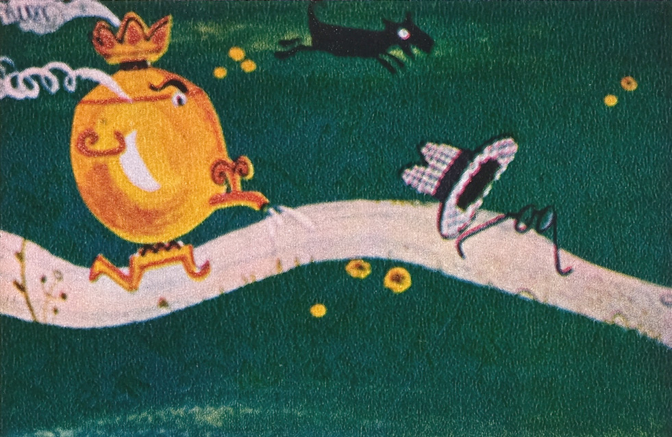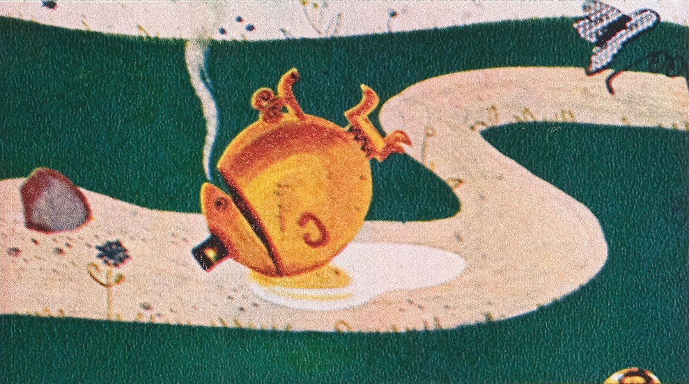 Гонится Самовар за ними, кипятком брызжет, а на дороге камень лежит. Шляпа и Очки перепрыгнули через него, а Самовар упал.