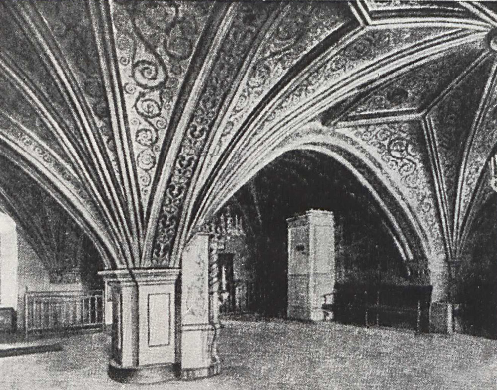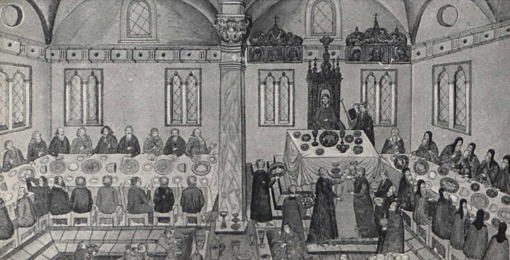 Так, наиболее ранняя из известных нам по источникам трапезная Троице-Сергиевой лавры 1469 года во многом повторяет новгородскую палату. Главное ее помещение представляло четырехугольный зал с одним столбом посредине. Вокруг столба были полки в виде ступенек одна над другой, покрытые тканями. На них ставились серебряные вызолоченные кубки. Это описание устанавливает определенное тождество между монастырскими трапезными и светскими зданиями, предназначенными для пиров. Так же, как и в новгородской палате, в трапезных вдоль стен помещались скамьи, что еще раз подчеркивает их глубокую связь с архитектурой и убранством жилых помещений.