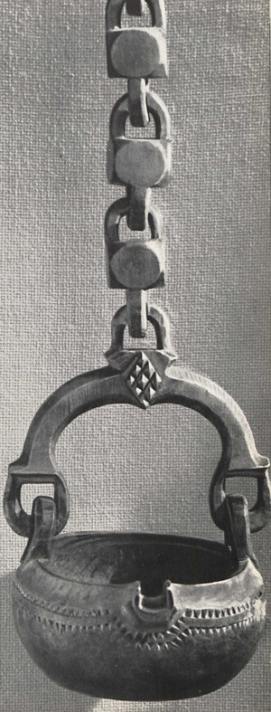 Этому впечатлению содействовало и освещение через слюдяные окончины днем и особенно вечернее — неровное, зыбкое пламя свечей, укрепленных либо на причудливо-орнаментальных висящих люстрах-хоросах, либо в литых или сделанных из просечного железа подсвечниках в виде ажурных трав, птиц и зверей.