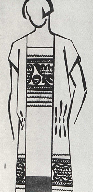 Орнамент как конструирующий форму и тяжесть. Орнамент как разбивка плоскости и в художественном и в конструктивном отношении», — так формулирует она правила орнаментации одежды.