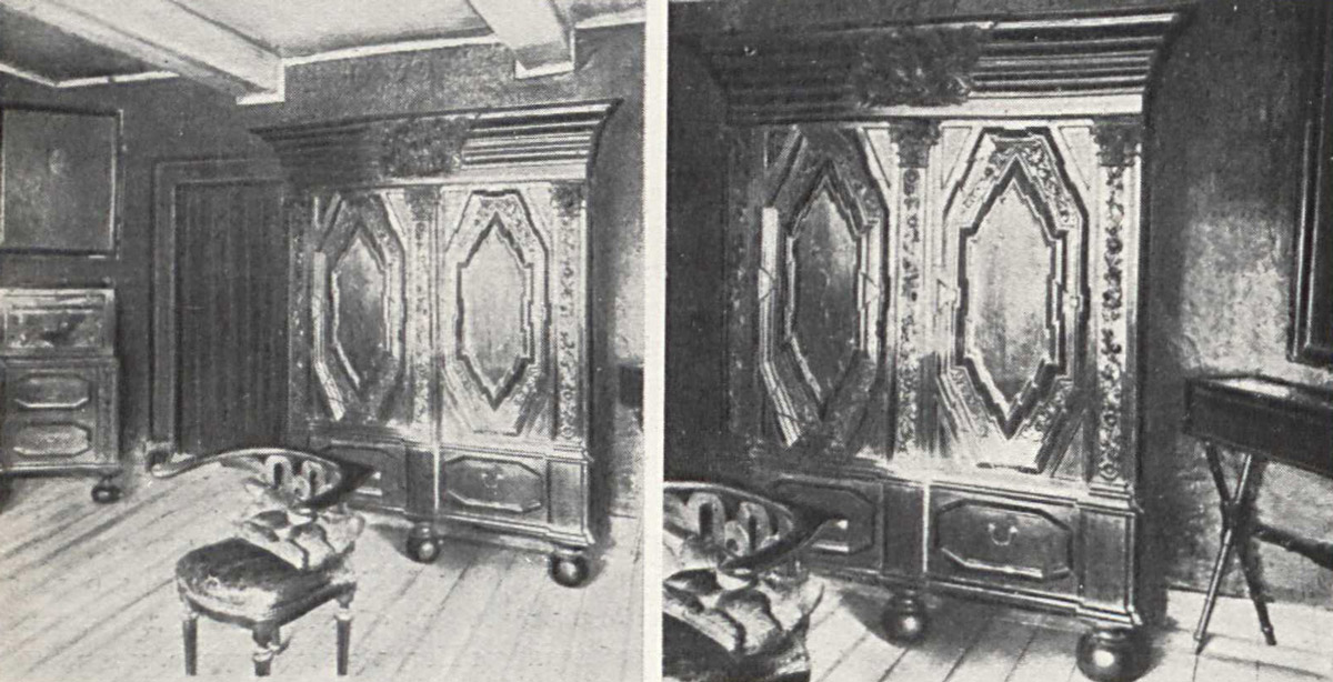 Новшеством в русском обиходе явились шкафы, которые в ХVII веке употреблялись очень редко. Поэтому естественно, что первые шкафы ХVIII века для белья, платья, книг, обуви и прочего были иностранного происхождения, главным образом голландские. Два подлинных таких шкафа сохранились в комнатах Летнего дворца. Это очень массивные, больше в ширину, чем в высоту, дубовые шкафы, на ножках в виде точеных, как бы несколько сплющенных под тяжестью шаров. Фасад разбит на две части тремя пилястрами, густо заполненными резным орнаментом. Они поддерживают сильно нависающий раскрепованный карниз с картушем в центре. Эти шкафы были, очевидно, широко распространены. Подобные им мы можем увидеть в петербургском домике Петра и в экспозиции Петровской галереи Государственного Эрмитажа.
