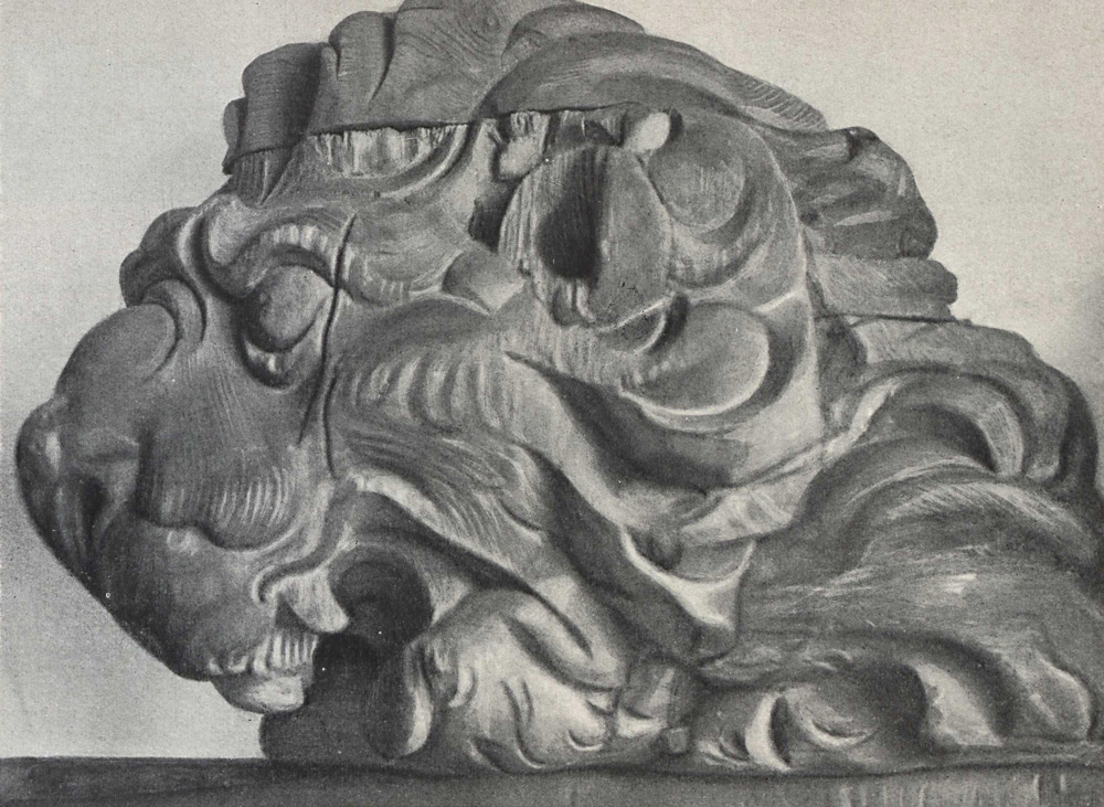 Из них особенно интересны две большие (к сожалению, не полностью сохранившиеся) львиные головы, решенные в горельефе, переходящем в круглую скульптуру. Они представляют собой великолепный образец монументально-декоративной резьбы в стиле барокко, полной необычайной экспрессии и образной выразительности, переданной сочно и живописно. При этом художественный эффект достигается здесь самыми простыми лаконичными средствами.