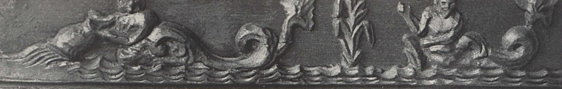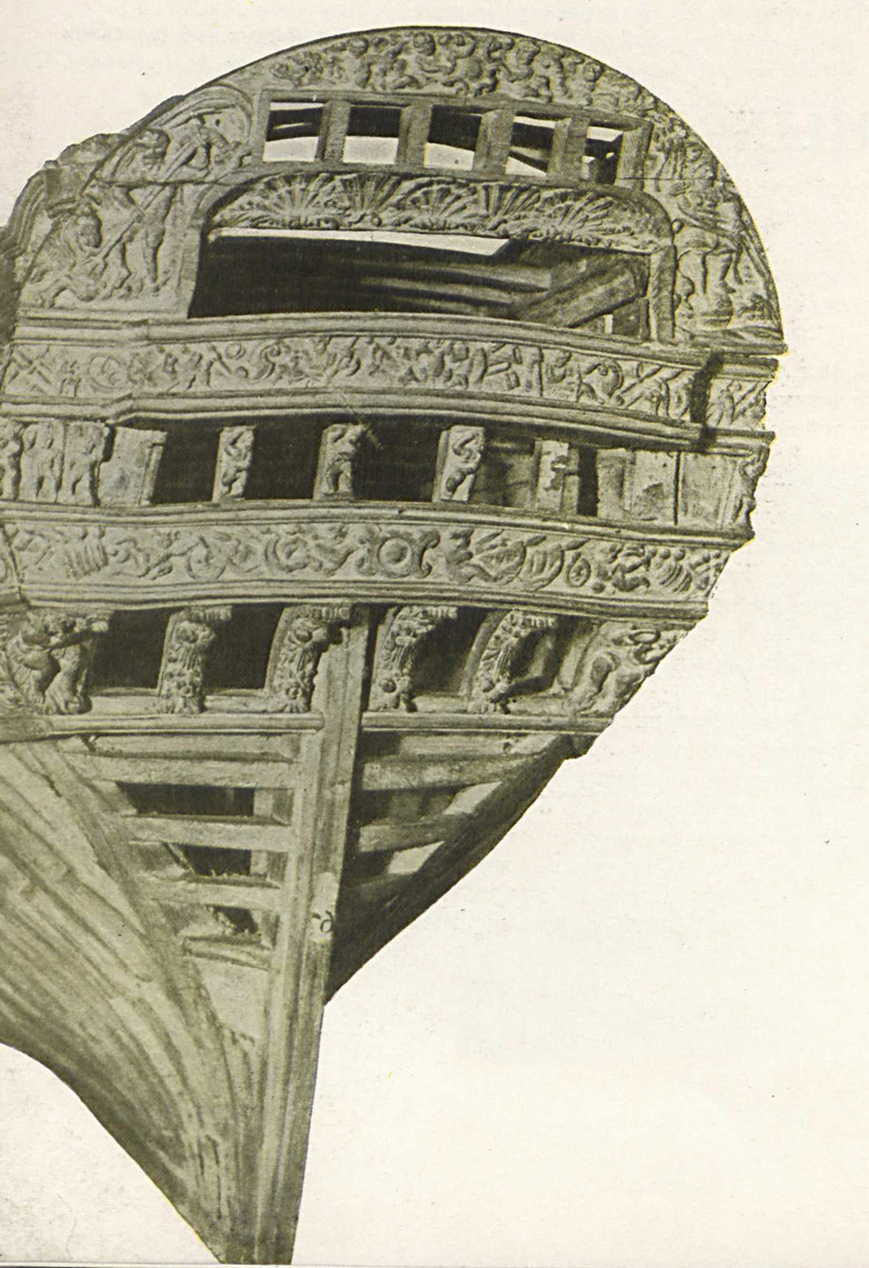 Более разнообразным по своим изобразительным и орнаментальным мотивам было украшение кормы. На больших кораблях оно решалось обычно в виде нескольких фризовых композиций, которые поддерживали кариатиды, кронштейны или пилястры.