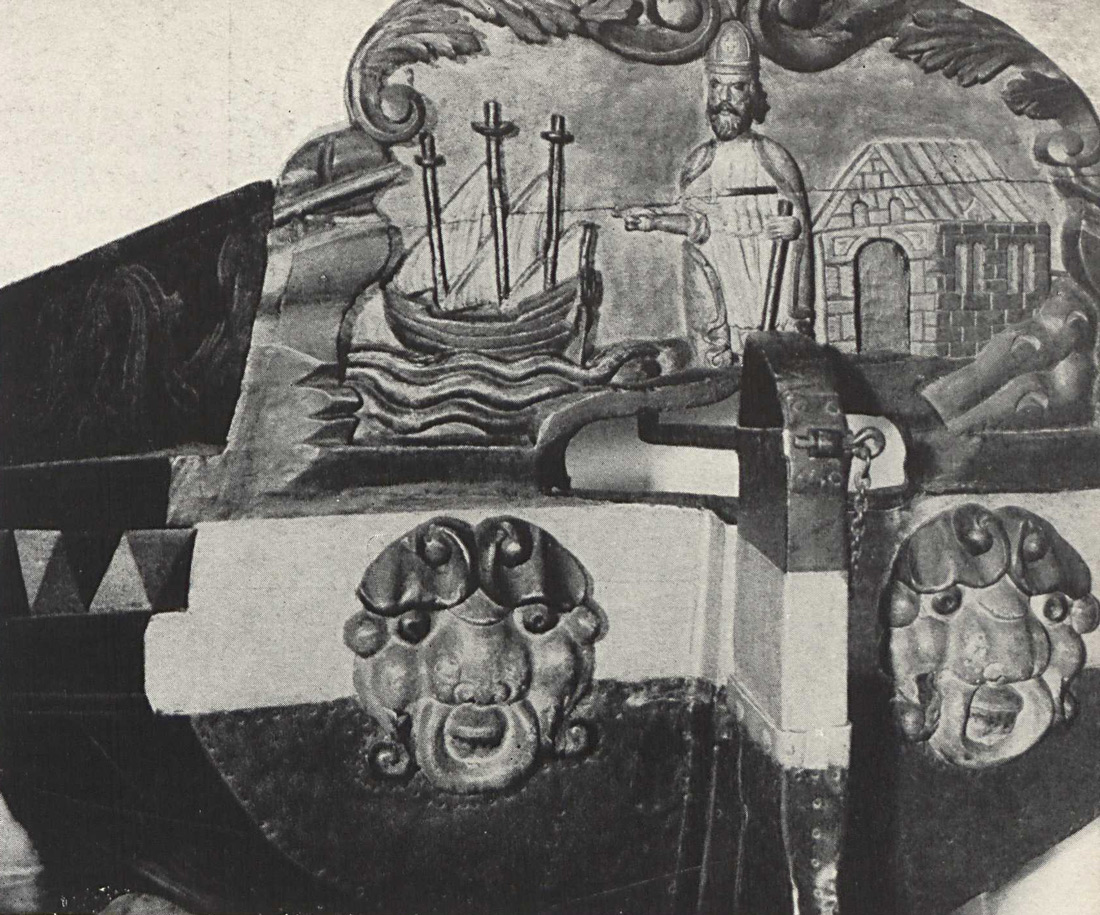 Однако дошедшие до нас свидетельства современников о резном декоре русских кораблей относятся уже к значительно более позднему времени. Так, английский купец Джером Горсей, попавший в середине XVI века в Россию, описывая виденный в Вологде флот царя Ивана Грозного, говорит, что на его кораблях, «поражавших величиной, красотой и странной отделкой», были резные «изображения львов, драконов, орлов, слонов и единорогов, так отчетливо сделанных и так богато украшенных золотом, серебром и богатой живописью».