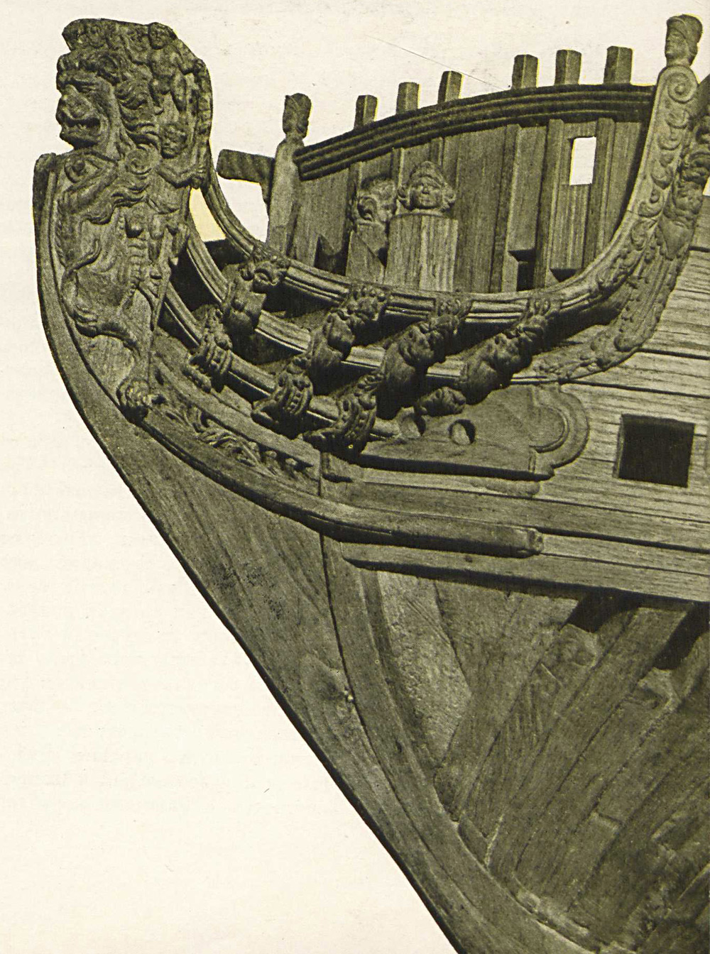 За спиной льва помещались одна или две человеческие фигуры. Прилегающая к носу часть борта была решена в виде трех профилированных полос, скрепленных кронштейнами, имевшими обычно форму женских торсов. Загнутые кверху концы этих полос заканчивались: на верхней — скульптурным изображением мужской головы, а на средней — кариатидой, переходящей в завиток растительного орнамента. Кариатиды поддерживали четырехгранный брус, украшенный львиной маской. Все вместе образовывало фантастическую, декоративно очень выразительную композицию, великолепно оформляющую носовую часть судна.