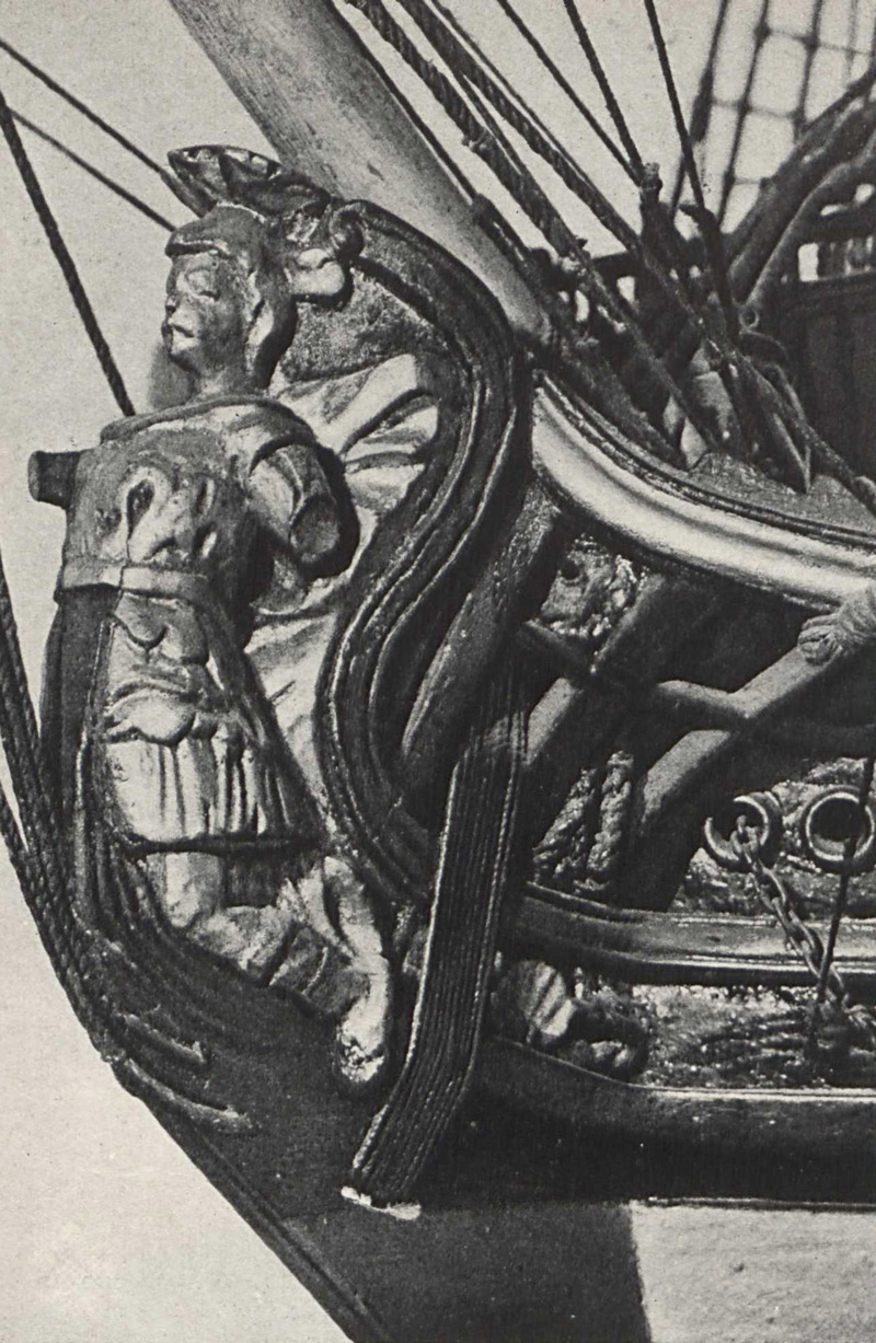 Помещение на носах судов скульптурных изображений воинов, героев или богов, обычно взятых из античной мифологии, особенно характерно для корабельной резьбы второй половины XVIII века, когда подобные изображения почти полностью сменяют декоративные композиции с изображением льва.