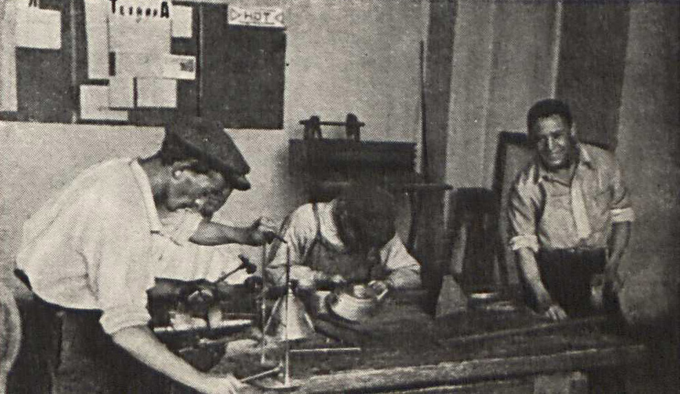 На другом снимке молодой человек в рабочем фартуке за допотопным фрезерным станком и его сверстник в студенческой фуражке за сверлильным станком не менее древней конструкции. Кто же эти люди с сильными натруженными руками? — Конечно, рабочие, — ответит каждый, кто не знает, что эти фотографии взяты из архива художника А. М. Родченко, профессора Металлообрабатывающего факультета ВХУТЕМАСа. А эти молодые люди — его ученики, наши первые художники-конструкторы.