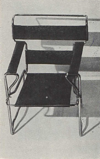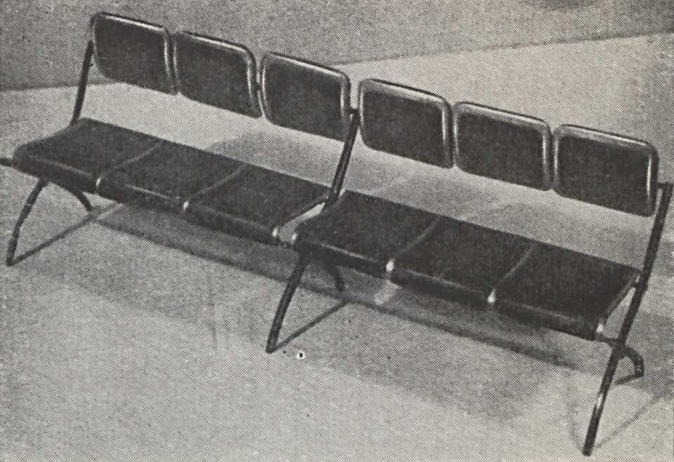 На некоторых из этих проектов стоит остановиться подробнее. Любопытно была сконструирована мебель для общественных помещений по предложению и проекту П. Галактионова. В основу конструкции этой мебели положены легкие, полые внутри алюминиевые трубки. Такая мебель занимает немного места, она легка, гигиенична, изящна и во многом предвосхищает образцы современной мебели.