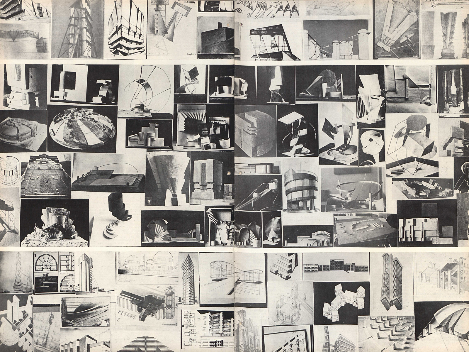 Верхний ряд: Объединенные левые мастерские (Обмас) архитектурного факультета (руководители Н. Ладовский, Н. Докучаев, В. Кринский). «Отвлеченные» и «производственные» (конкретные) работы студентов на выявление формы, массы и веса, конструкции и пространства. 1920—1923 гг. (работы студентов М. Коржева, В. Петрова, Ю. Спасского, Н. Травина, М. Туркуса, С. Гельфельда, Г. Гольца, Н. Тихонова).