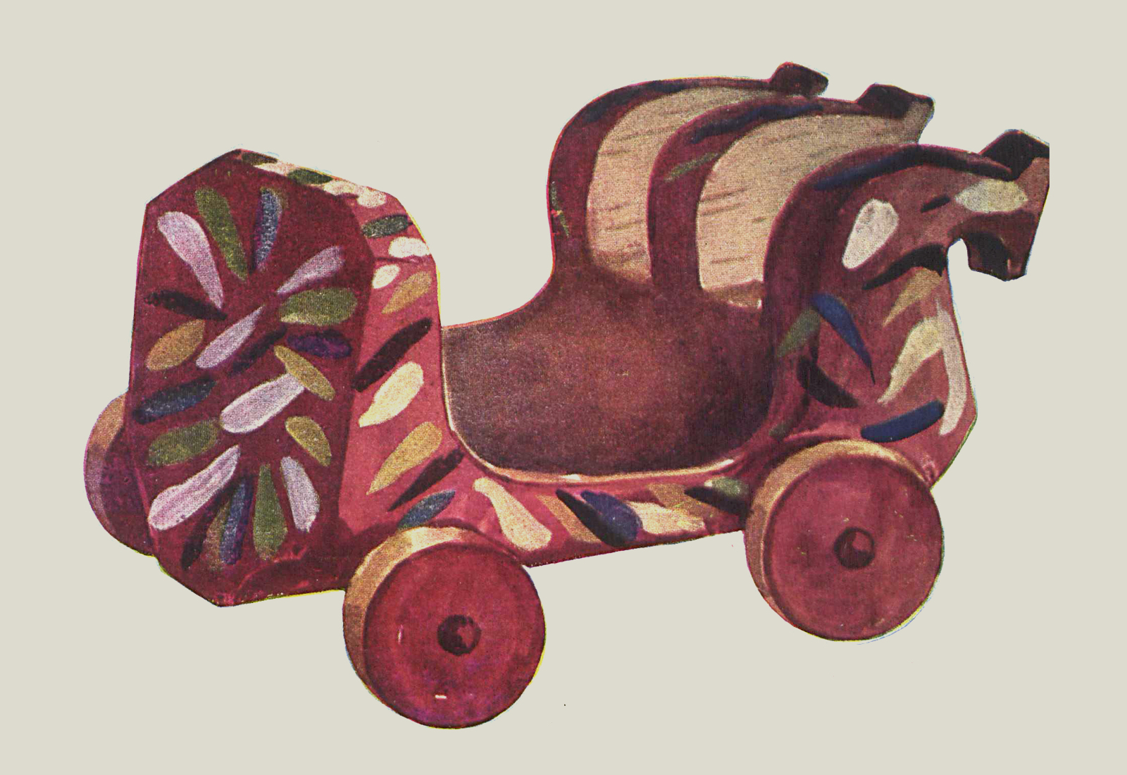 Деревянная игрушка — один из тех замечательных видов народного творчества, который и сегодня обладает большой жизненностью. Традиционные кони-каталки, кони-салазки и кони-скамейки могли бы отлично служить и нашим детям. Полные юмора птицы и строгие куклы, кони-каталки, расписная игрушечная утварь, лодочки и карусели, медведи, поднявшиеся на дыбы, — все эти игрушки могут быть нарядными и дешевыми, простыми и обаятельными, одинаково пригодными и для игры, и для украшения комнаты.