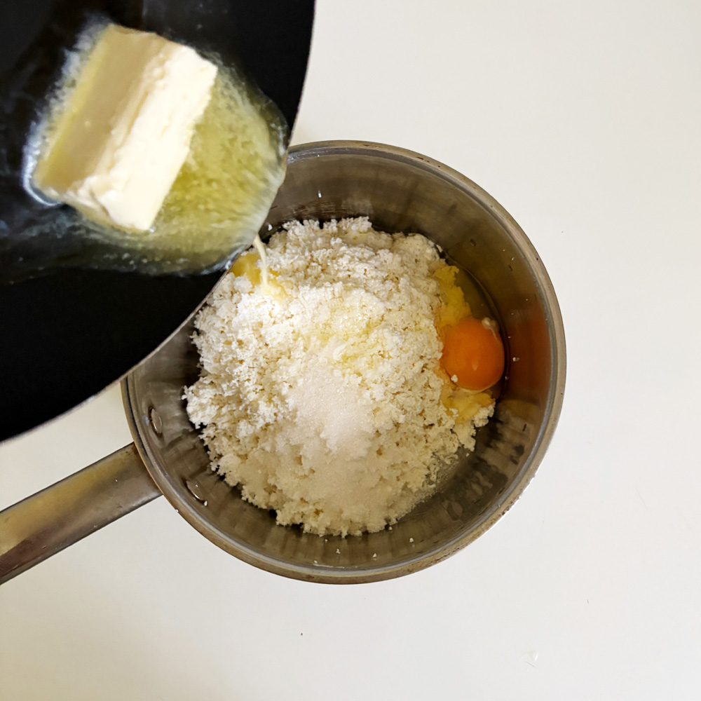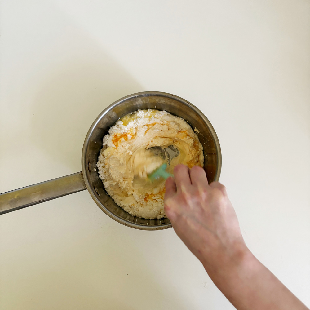 Добавить пшеничную просеянную муку, слегка растопленное сливочное масло, яйца, сахар, соль и хорошо перемешать.