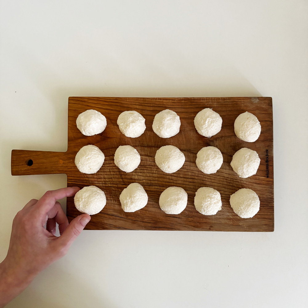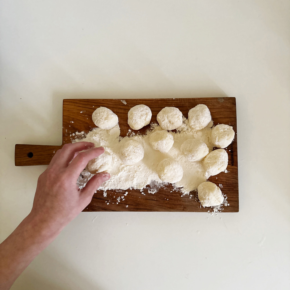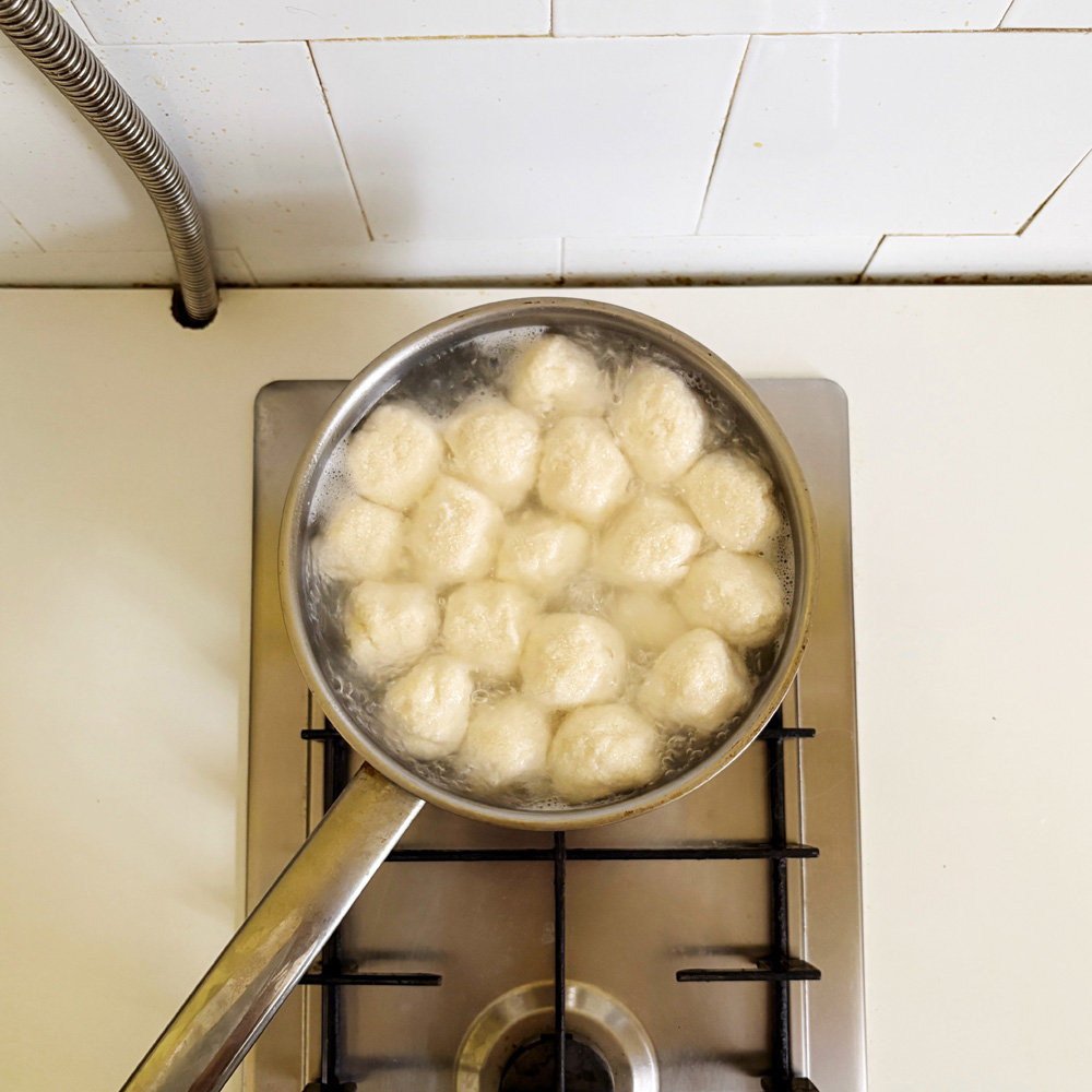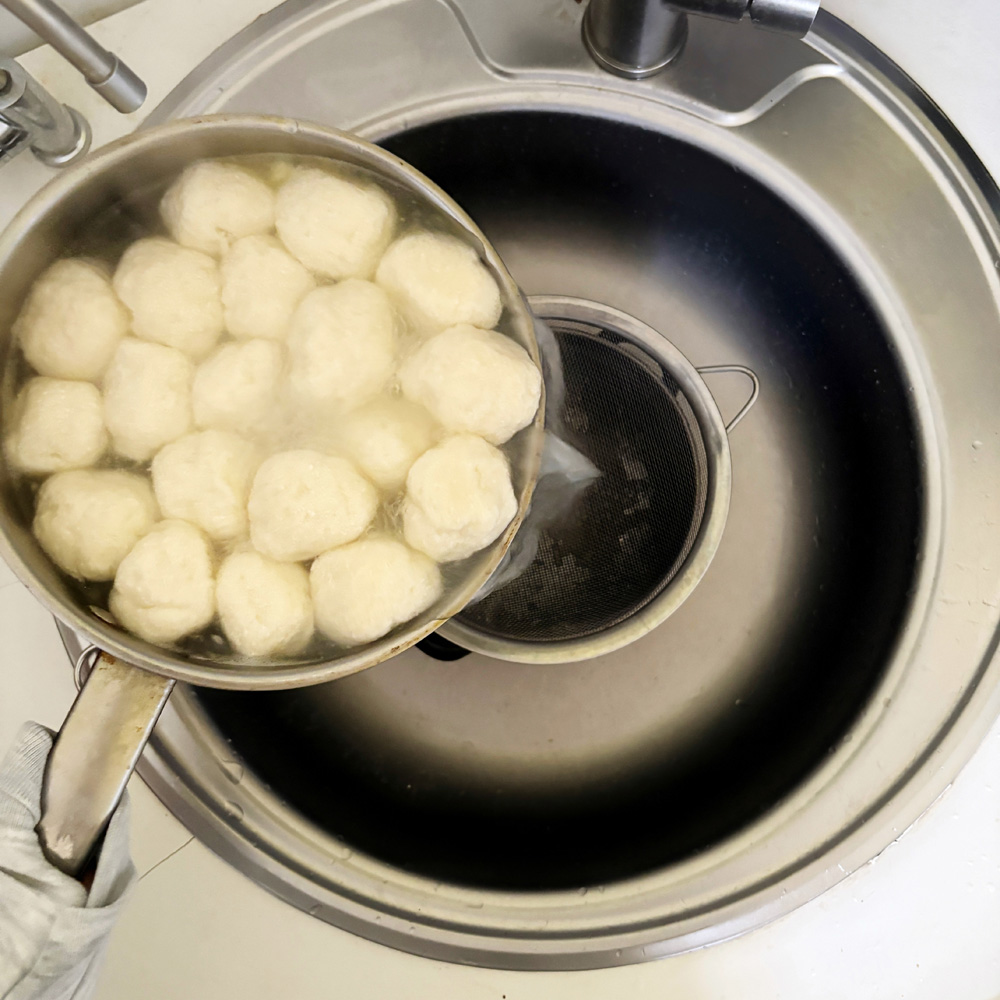 Полученную массу разделать на шарики весом 20–25 г, отварить их в кипящей воде, откинуть на сито, дать стечь воде.