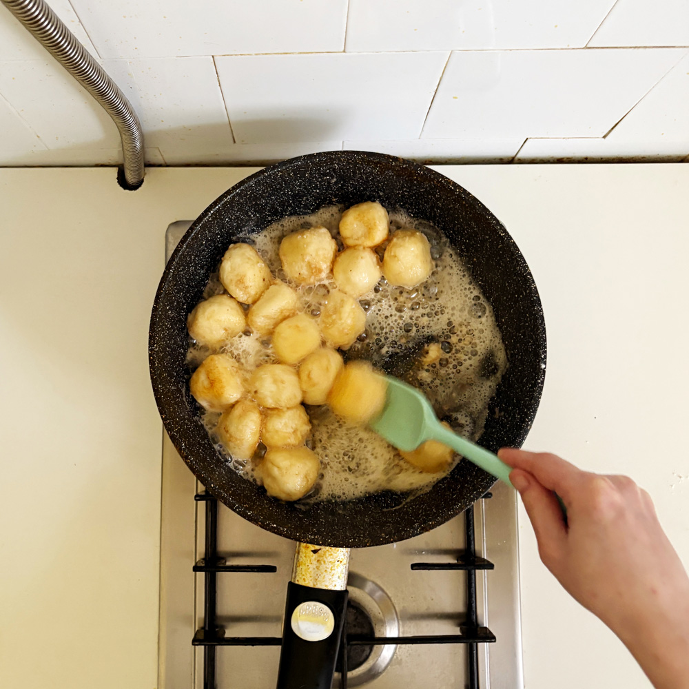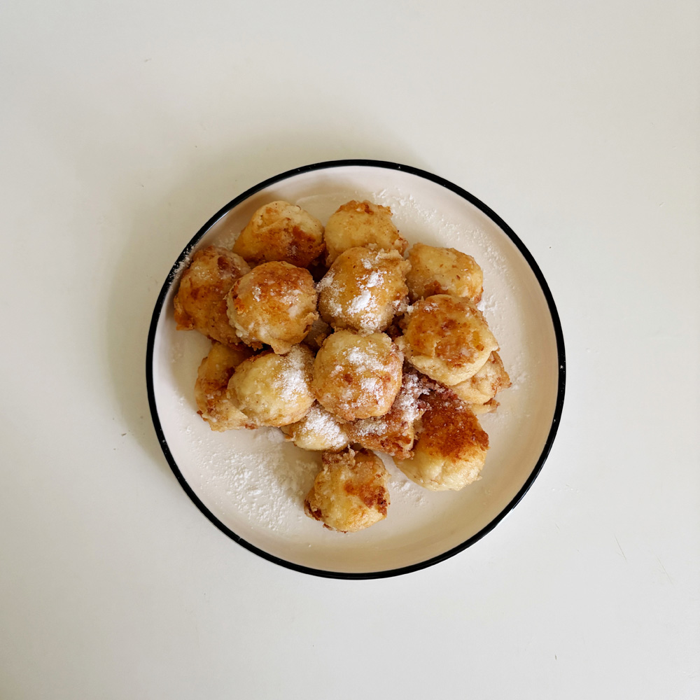 Панировать шарики в пшеничной муке, обжарить в топлёном масле до образования румяной корочки. При подаче посыпать сахарной пудрой.