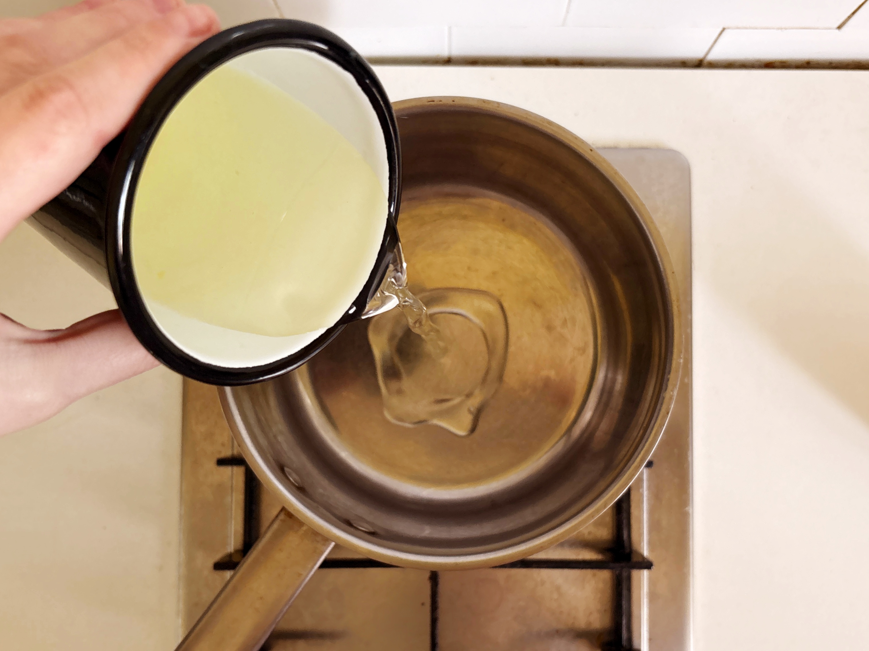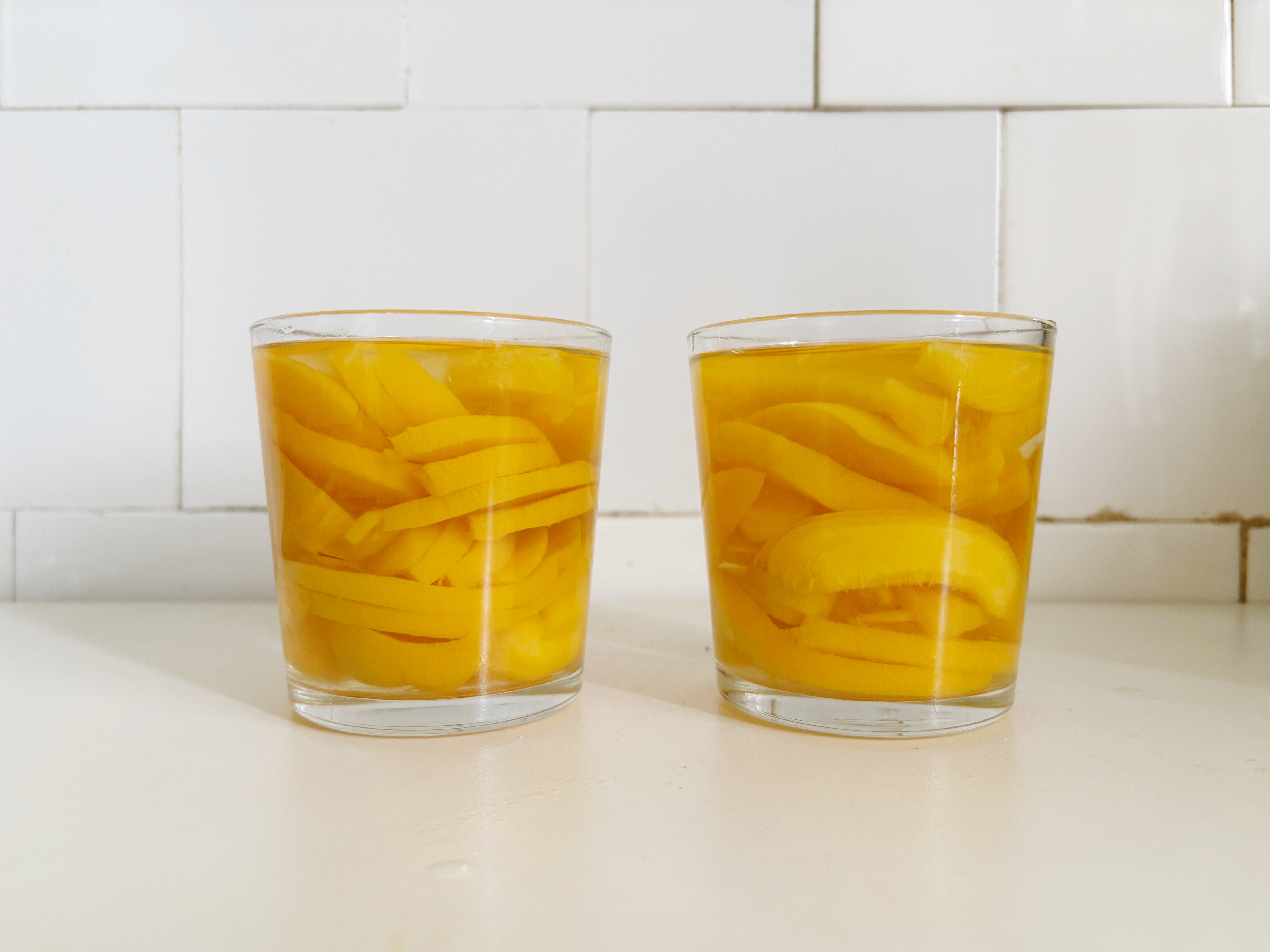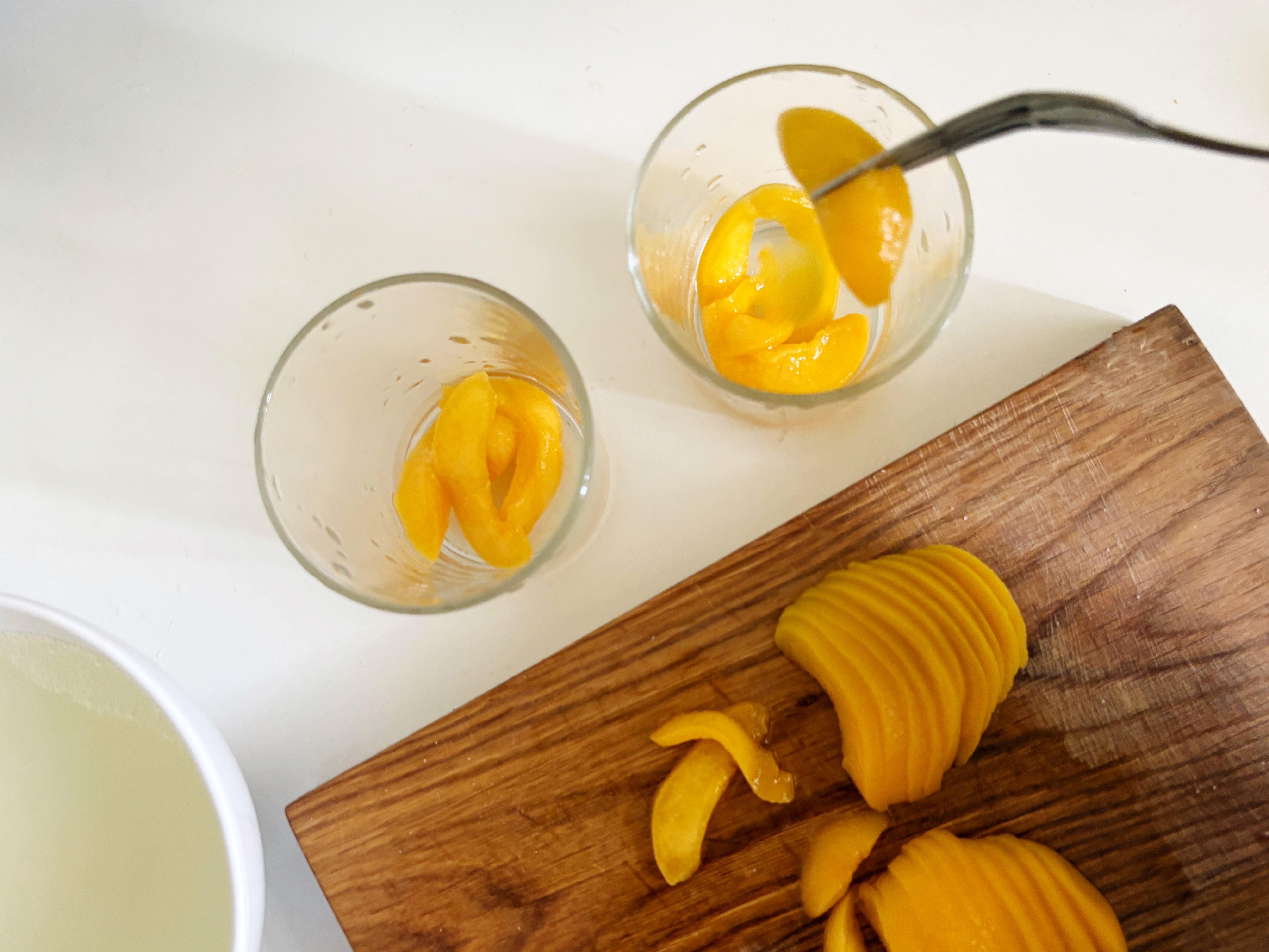 Персики нарезать тонкими дольками. Сироп от консервированных персиков развести водой, добавить сахар и нагреть до кипения. После этого в сироп ввести желатин, лимонную кислоту и профильтровать.