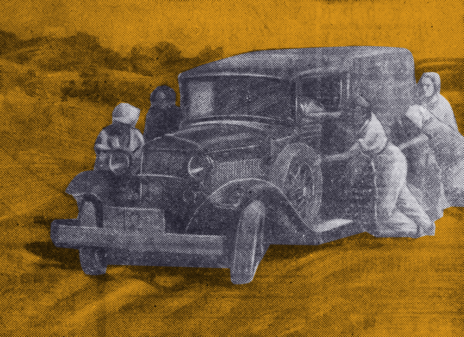 Первый женский автопробег по маршруту Москва—Петропавловск—Аральское море—Киев—Москва. На фото: водительницы подталкивают застрявший в песках Малых Кара-Кумов «пикап».