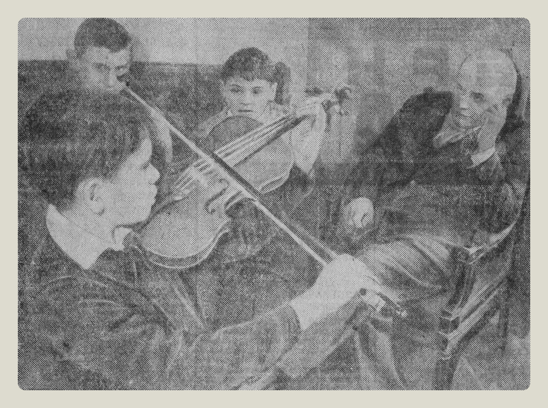 Маленькие скрипачи из Особой детской группы при Консерватории на роке у проф. А.И. Ямпольского. Играет Леня Коган, слушают Ростик Дубинский и Нюма Латинский.