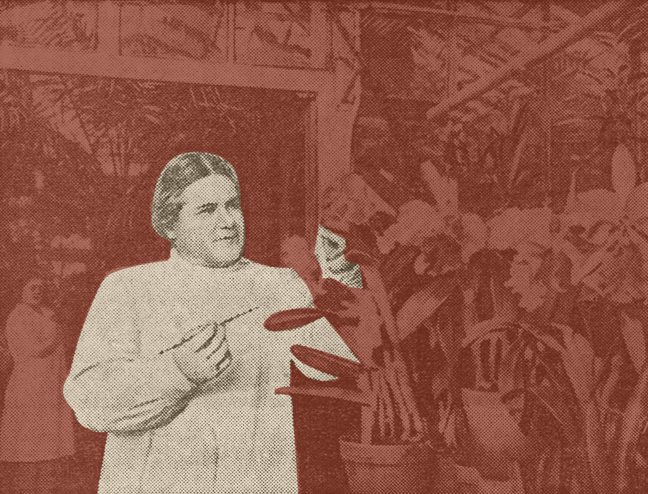 На снимке: старший садовод В. Селезнева осматривает цветущие орхидеи.