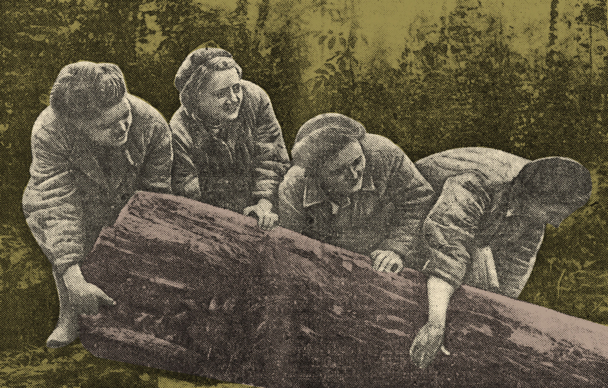 Москвичи на лесозаготовках. Домкинский леспромхоз. На снимке: молодёжная бригада Е. Федотовой, награждённая почётной грамотой ЦК ВЛКСМ и значками «Отличнику Наркомлеса». Бригада досрочно выполнила порученное ей задание по заготовке леса.