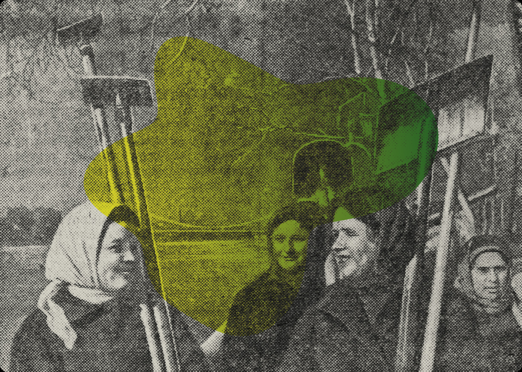На фото: Молодежно-стахановская бригада уборщиц Центрального парка культуры и отдыха им. Горького. Впереди О. Хрысанова и Е. Рыстаева.